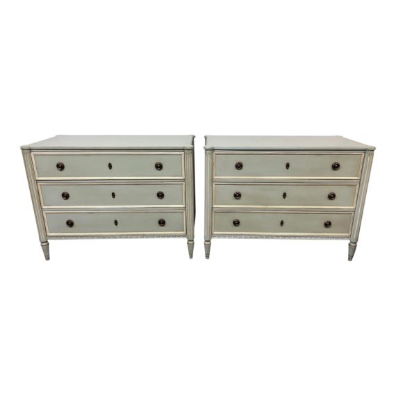 Design Plus Gallery presents the Frontage Etienne 3 Drawer Chests, a Pair. With a design based on French antique dressers, these chests features brass ring handles, fluted column legs and tapered arrow feet. The three drawers feature dovetail joinery and soft closing mechanisms. The drawer’s insides have a natural wood appearance. Modernized features include a power outlet with one USB port and one electric socket. The light blue/green patina is the result of a French patina finish. Top drawer on one chest has been broken and repaired extensively, as per photos; it still works smoothly. Minor surface wear from use (see photos); one chest has repair to dovetail joint on drawer and 2 drawers where soft-close is incomplete (the do close completely).