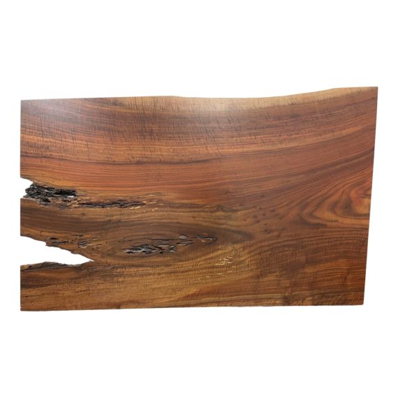 Design Plus Gallery presents a Full Size Custom Live Edge Wood Wall Headboard. Solid redwood slab has a beautiful burl wood quality. Natural knots of the wood are left in juxtaposition with the clean straight lines of the silhouette. Back has been mounted with hardware for hanging on the wall with a cleat. Headboard does not comes with the coordinating cleat and would require purchasing at a hardware store. Slab is in good condition.