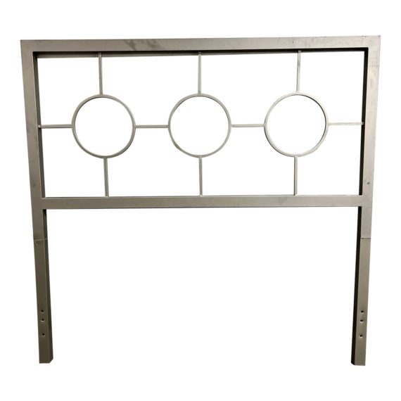 Design Plus Gallery presents a Silver Headboard with Open Circle Pattern for a Full Size Bed. There are three circles rounding out this contemporary look.l the headboard itself is easy contemporary in styling and will work in so many homes. Does have visible wear from age + use.