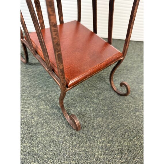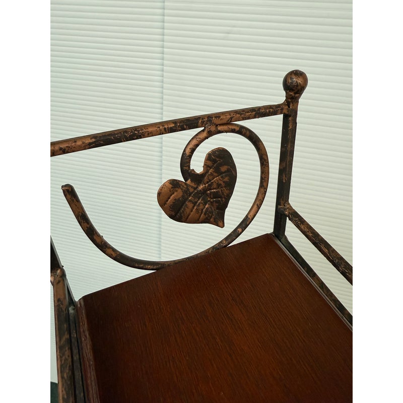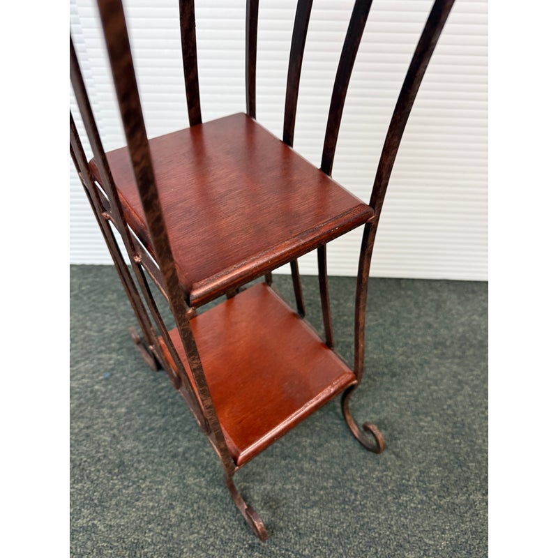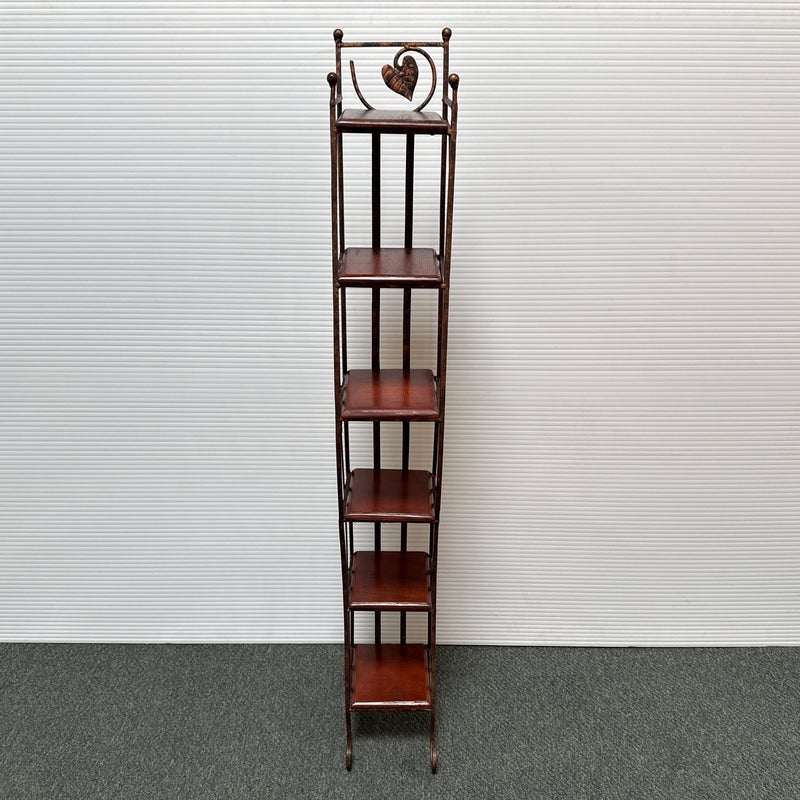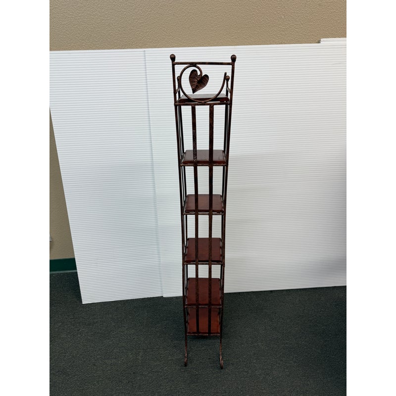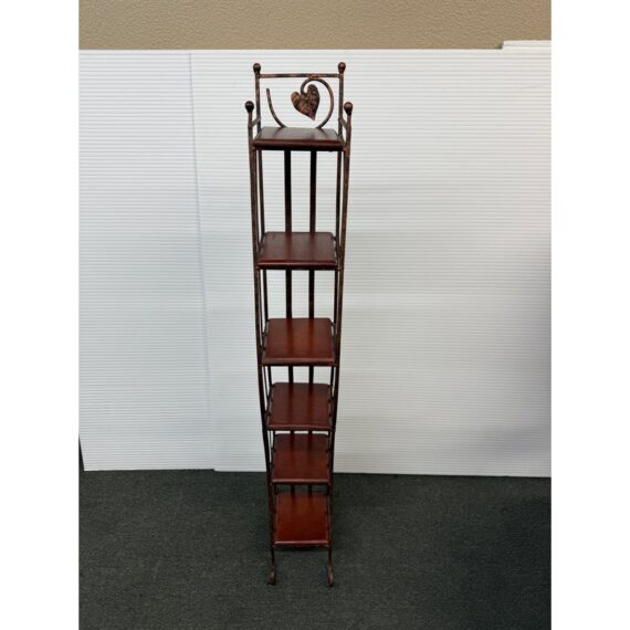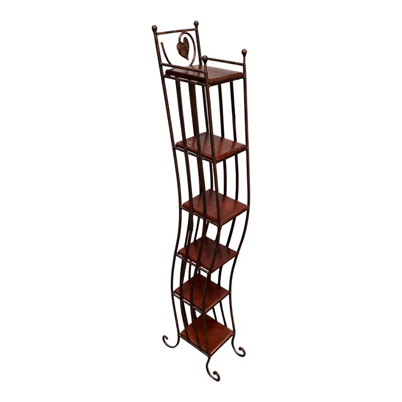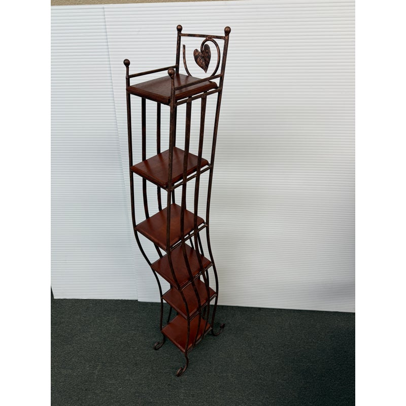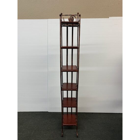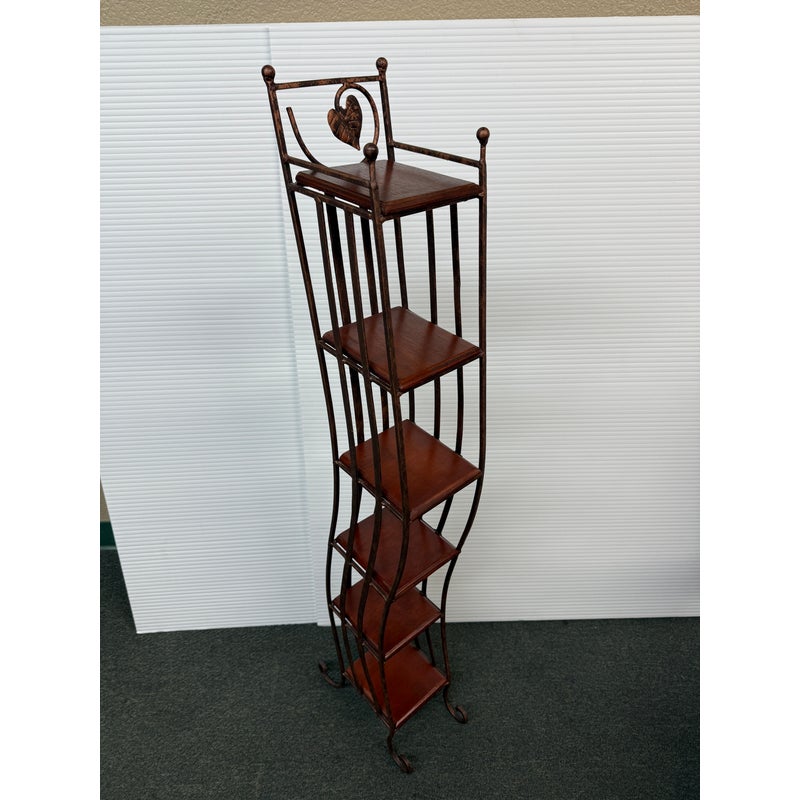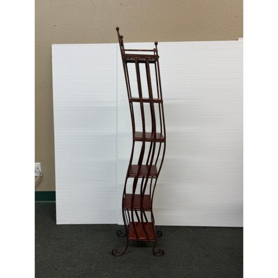 Design Plus Gallery presents a Display Shelf. Six beveled wood shelves are set within a copper finished wavy metal tower, with a very small footprint. Display your small treasures or treasured CD’s! Light wear; condition is consistent with age and use.