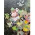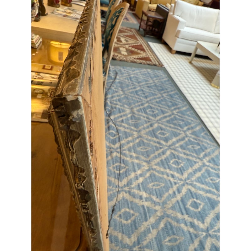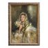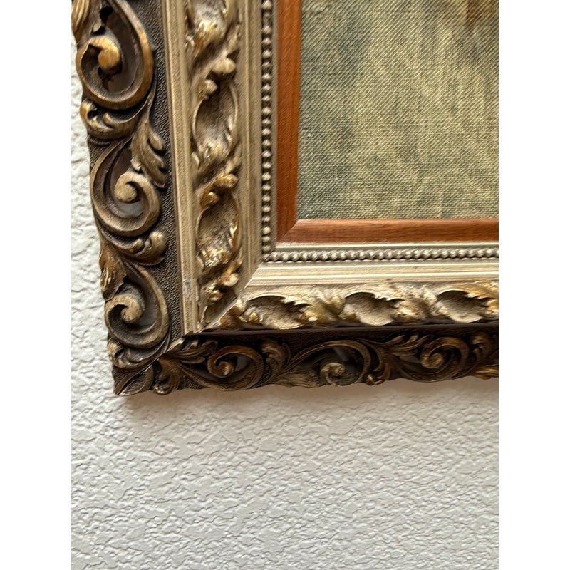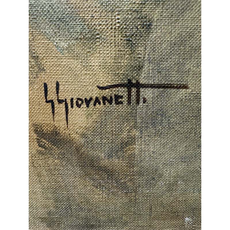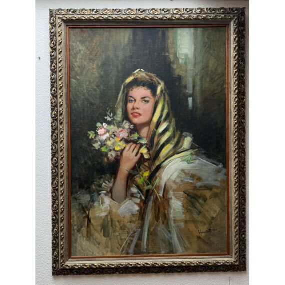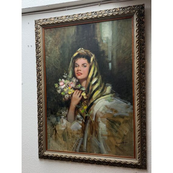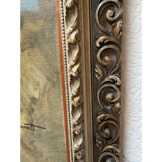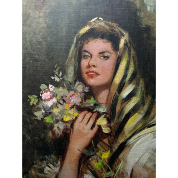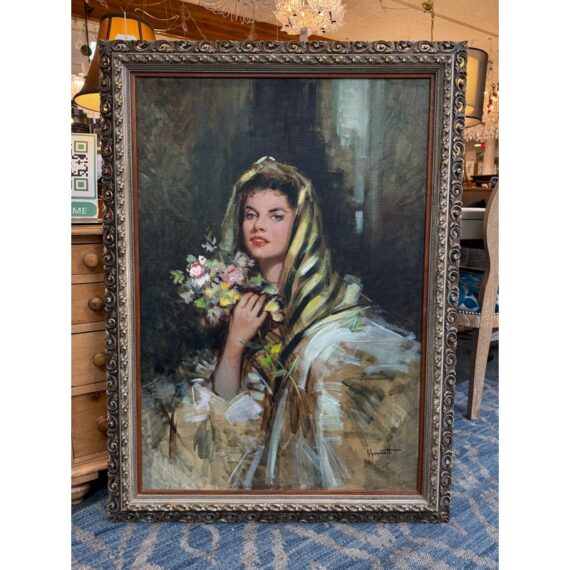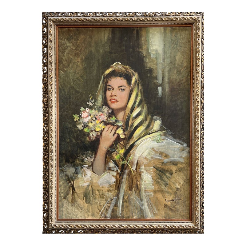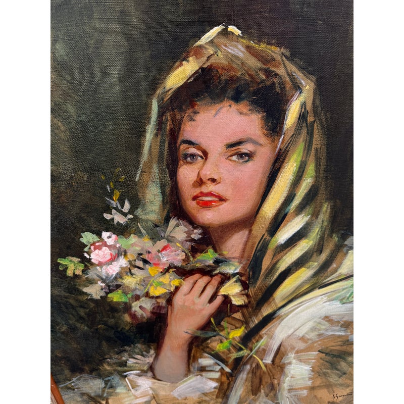 Design Plus Gallery presents an Oil Painting of a Woman by G. Giovanetti. This art piece depicts a beautiful woman, resembling the likes of Sophia Loren, wearing a gold striped scarf on her head while posing with flowers. The painting further captures the grace of the woman with its choice of frame. The ornate framing as an inner wood border with carved details of two layers of botanical accents. The artist’s signature is located in the bottom right corner. A hanging cord is attached to the back of the frame for easy mounting. Minor wear from age and use; painting is in good condition.