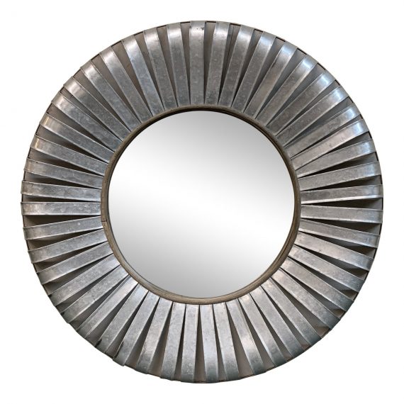 Design Plus Gallery presents a Industrial Metal Wall Mirror. Galvanized metal is fashioned in a starburst formation. Hammered brass banding surround the perimeter of the round mirror and outer edge of overall form. minor wear on finish adds to the patina of the industrial shabby chic feel.