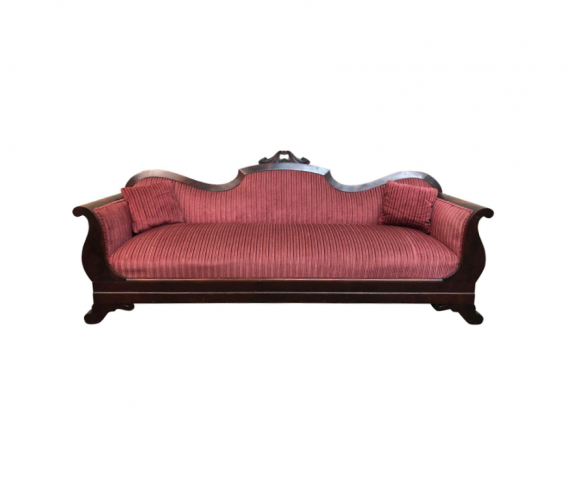 Design Plus Gallery presents a beautifully upholstered Victorian sofa. Perfect for the parkour, or an eclectic studio, this garnet sofa will attract attention form every angle. The tonal ribbed fabric is soft to the touch and pleasing to the eye, as the rich wood tones curve around it.