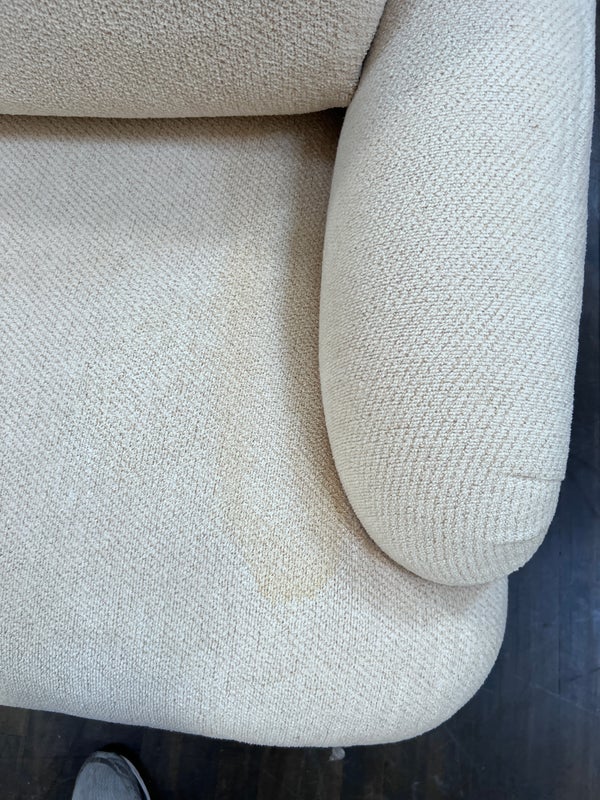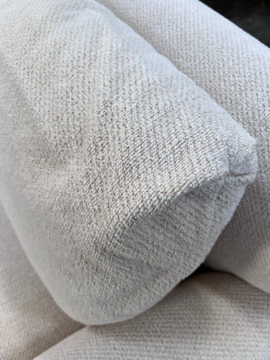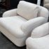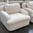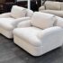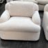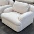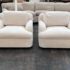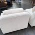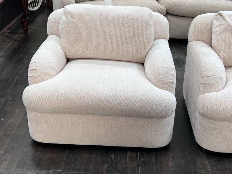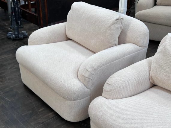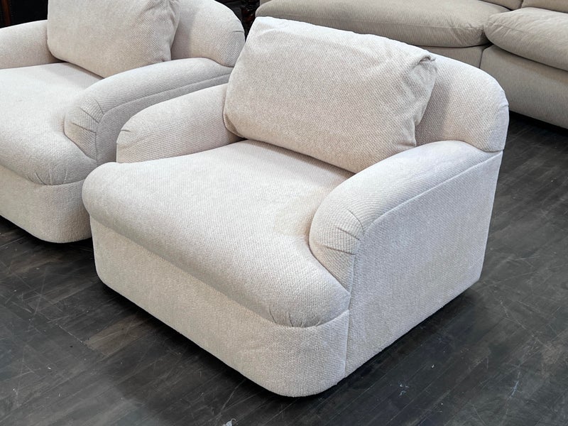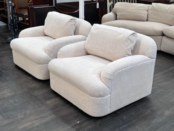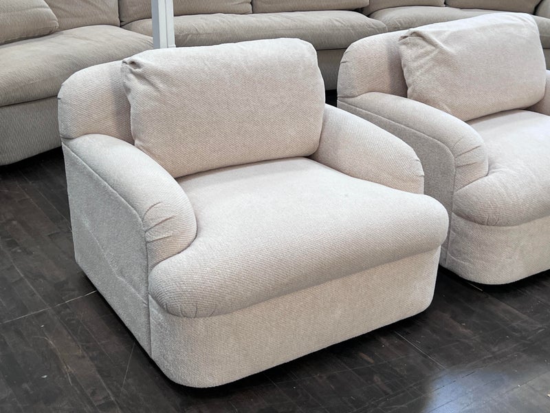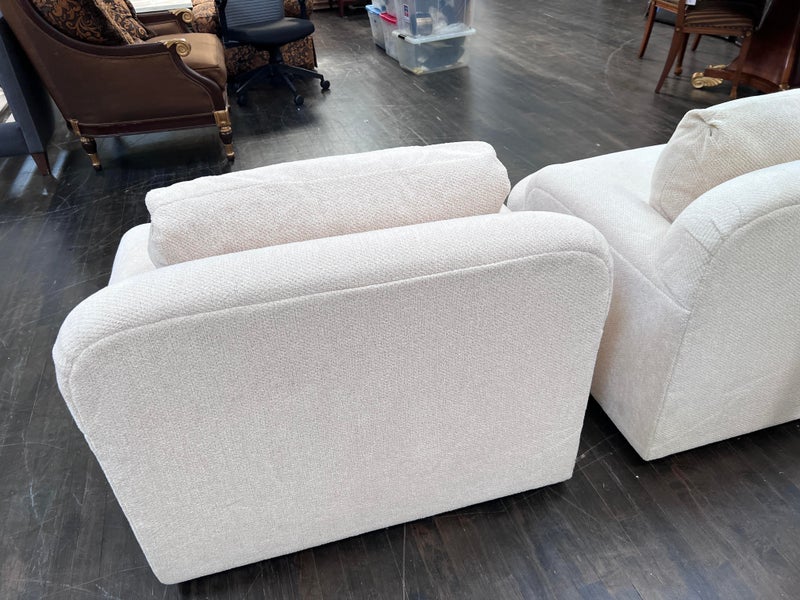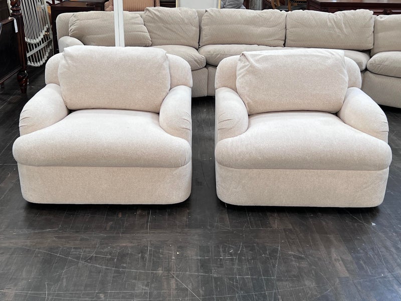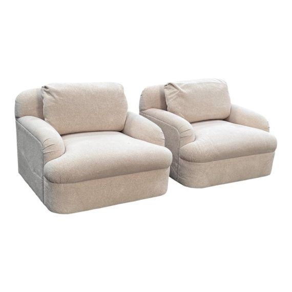 Design Plus Gallery presents a Pair of Custom Swivel Chair. English rolled arms with loose back and seat cushions. Upholstered in a off white fabric. Visible stains on the fabric. Would benefit with a professional cleaning or new upholstery. In good condition, visible and minimal wear from usage + age. Designed by Gary Hutton in the Early 21st Century. Made in USA.