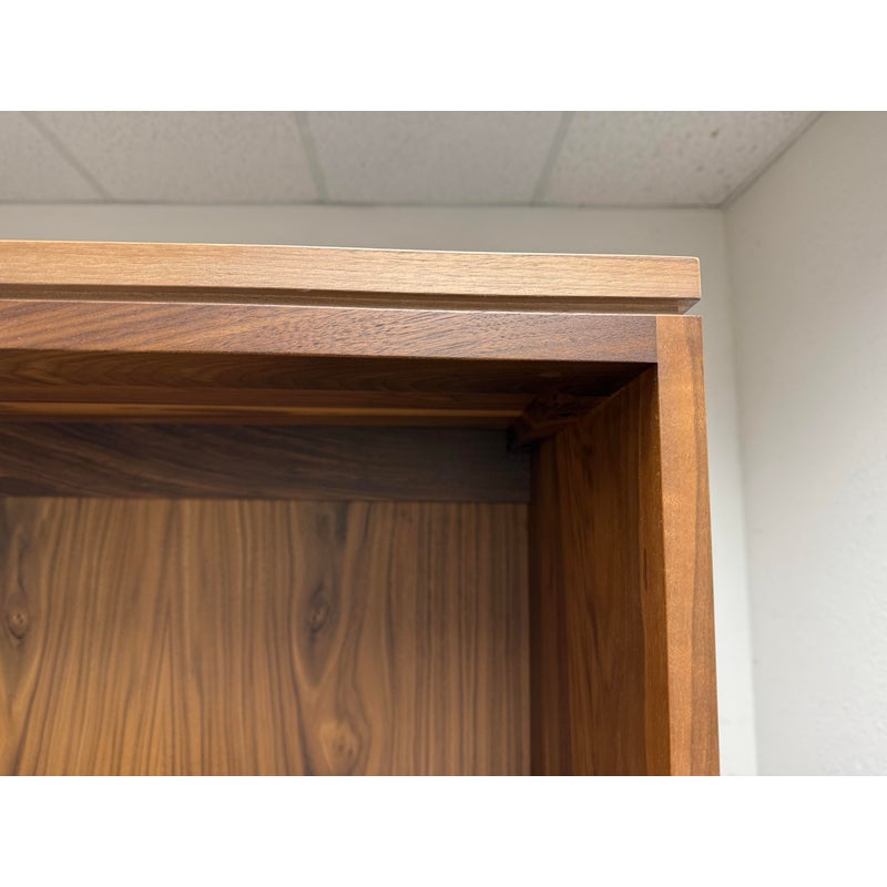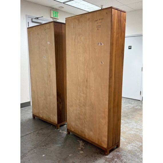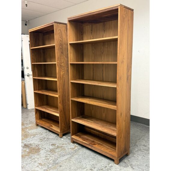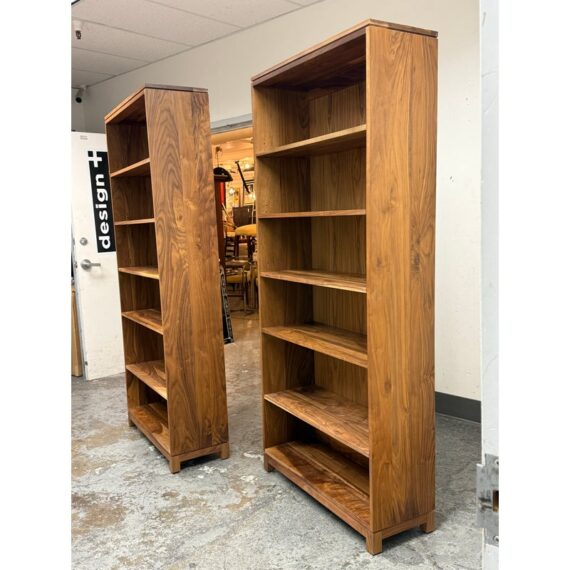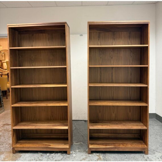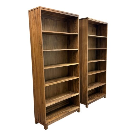 Design Plus Gallery presents a Pair of Oxford Walnut Bookcases from Gat Creek. These shelves are made from sustainably sourced Appalachian walnut wood. They have a natural finish that highlights the wood’s grain with warm undertones. Standing tall the Oxford shelves offers both function and flexibility. There is one fixed shelf for solid structural support and four adjustable shelves on each that allow you to customize the space for books, decorative pieces, or collectibles of varying heights. In good condition, visible and minimal wear from usage. Made in USA.