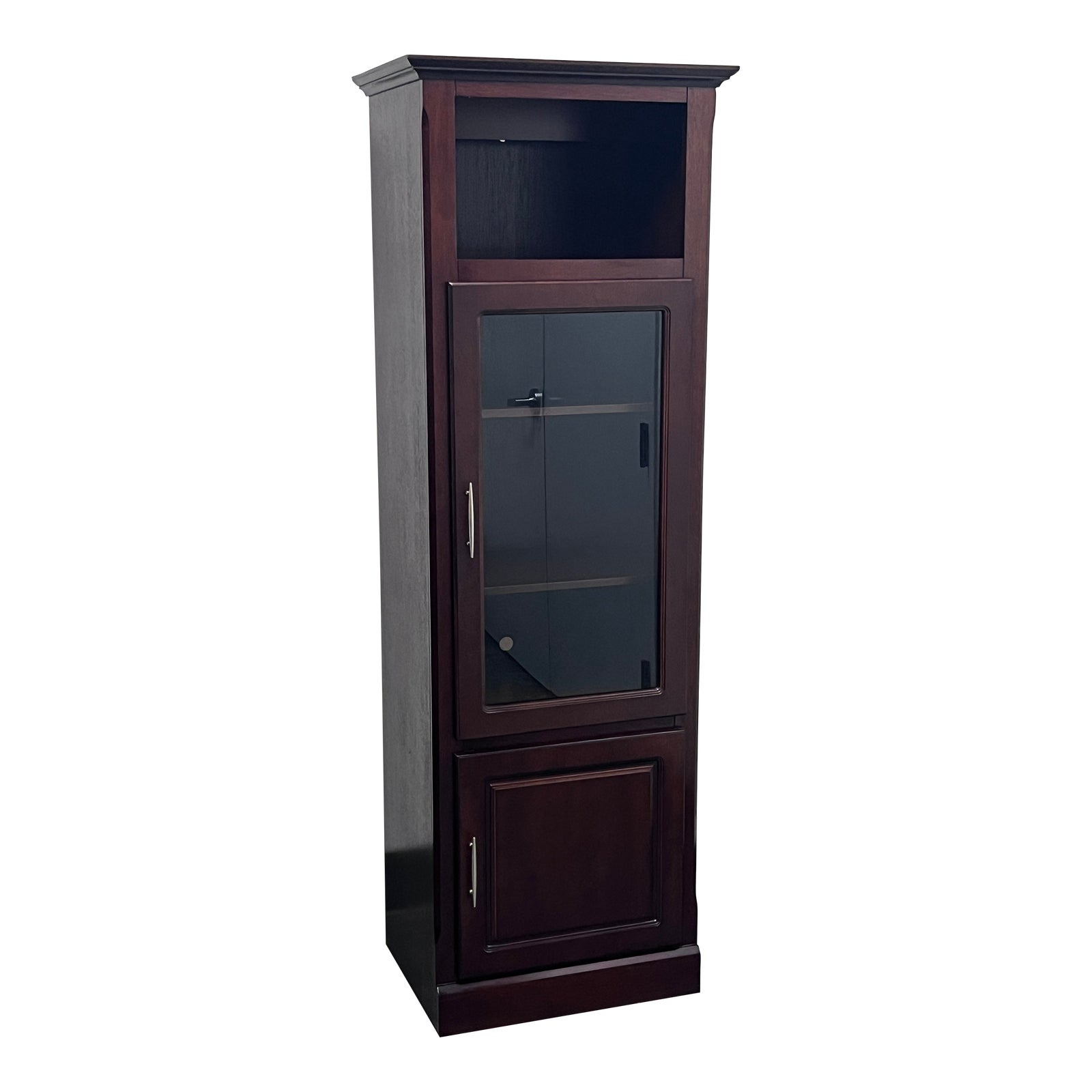 Design Plus Gallery presents Right Hinge Media Tower from General Furniture. In a dark espresso mahogany veneer with open top shelf, an inner compartment of three shelves contained by a glass door, and one cupboard door at the base is the perfect blend of concealment for your media room needs. In good condition, wear consistent with age + use.