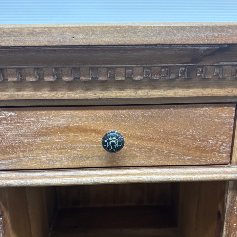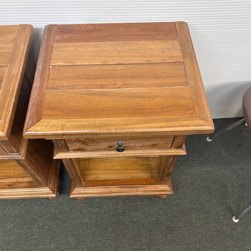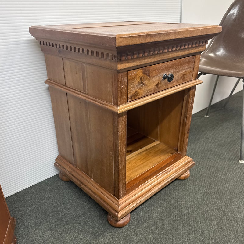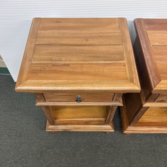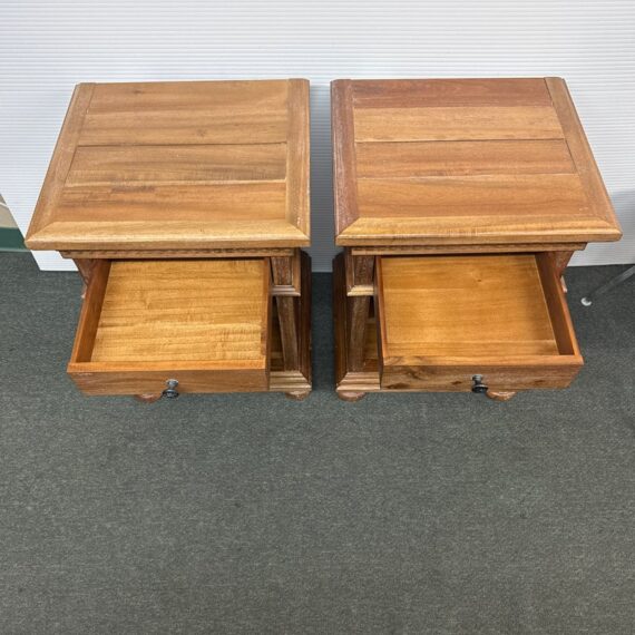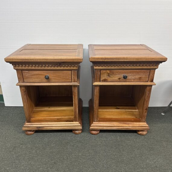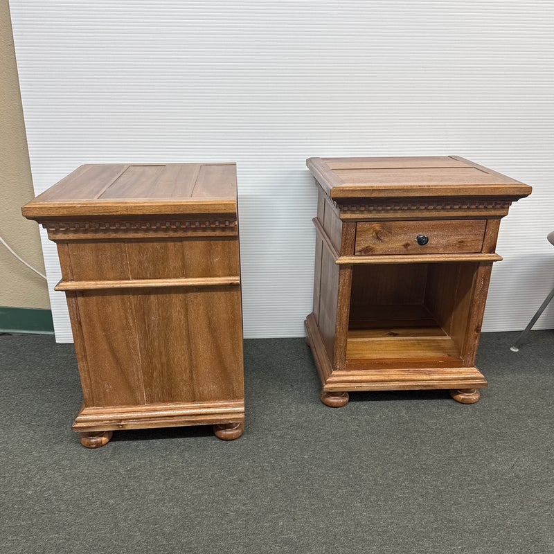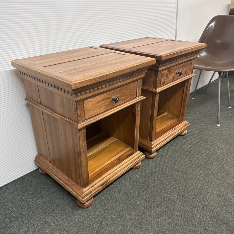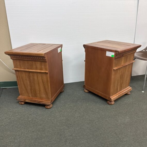 Design Plus Gallery presents a Pair of St. James Queen Open Nightstand by Restoration Hardware. Designed by Geoffrey Hawkes. Evoking the architectural references of turn-of-the-century design, each elegant nightstand offers open and closed storage and is lovely bedside. Detailed by hand-carved fluted cornices, corbels and dentil carving, all constructed of hardwood with mortise-and-tenon joinery. Soft natural finish. Light surface wear; good condition overall. Made in Vietnam.