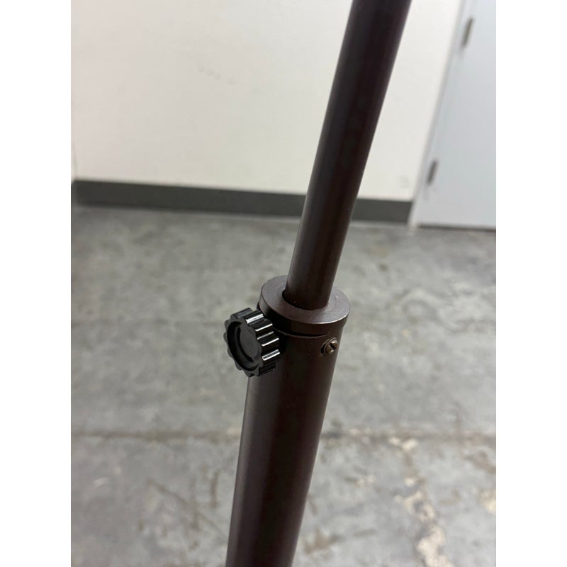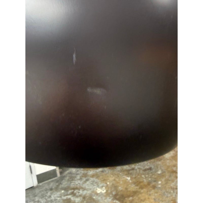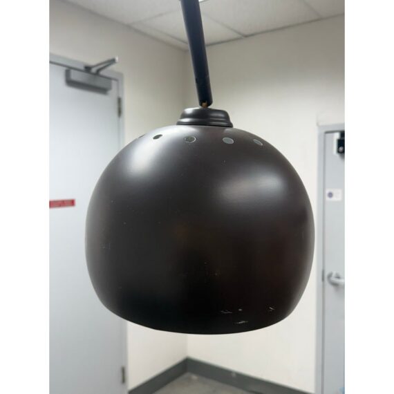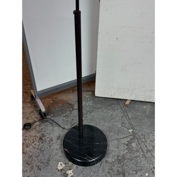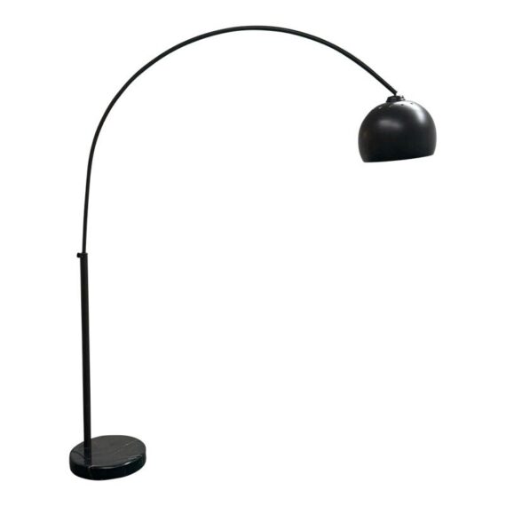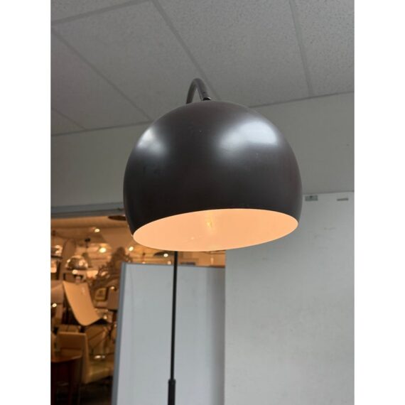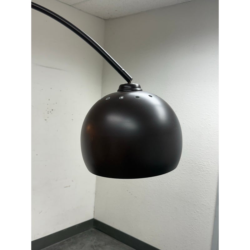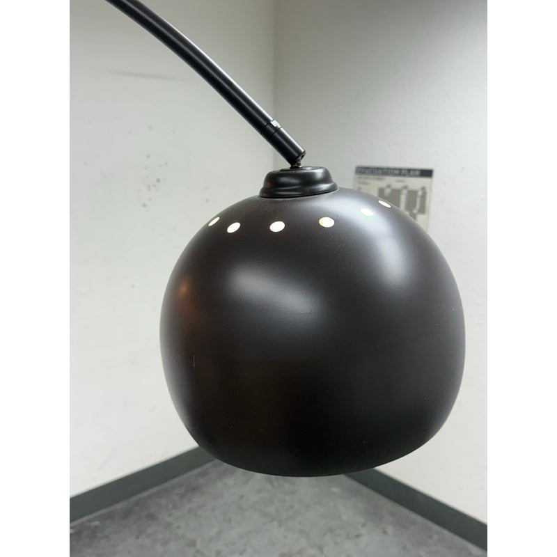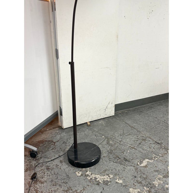 Design Plus Gallery presents an Arc Floor Lamp from George Kovacs. This arc-form floor lamp pairs a sweeping metal arm with a domed shade for a bold, sculptural profile. The shade includes small perforations along the upper rim that add subtle detail and visual interest. The frame is in a rustic brown finish with a round black marble base for steady support, and the lamp includes a cord with a foot switch for on and off control. This finish is discontinued with the brand and it is in good condition with visible and minimal wear from usage.