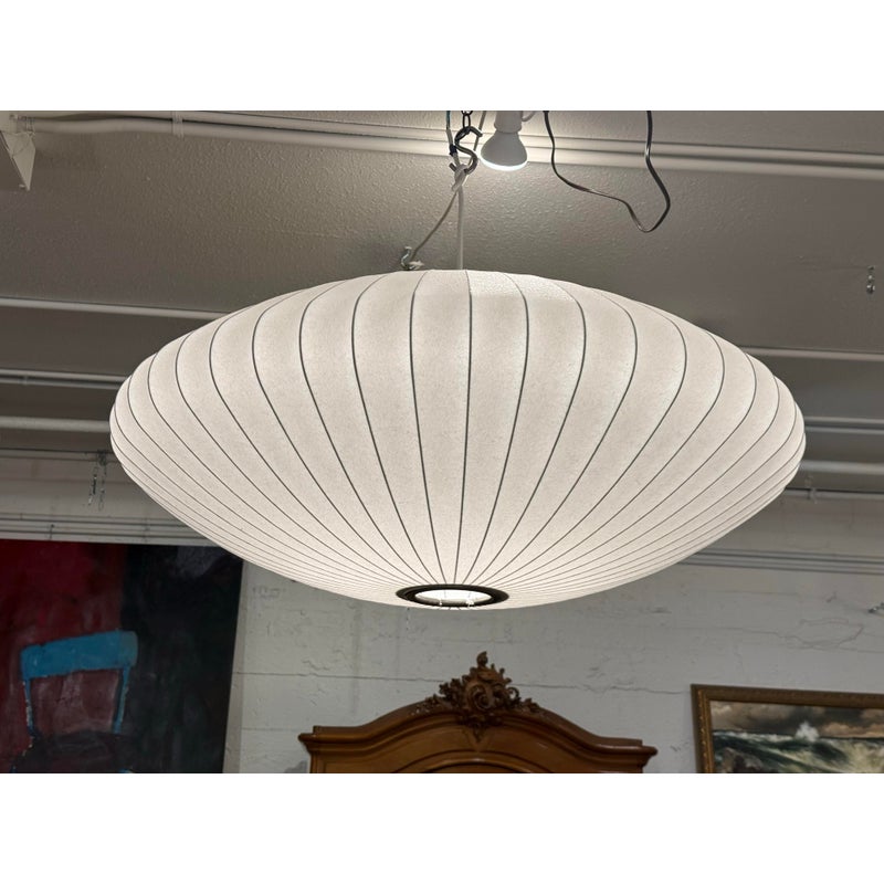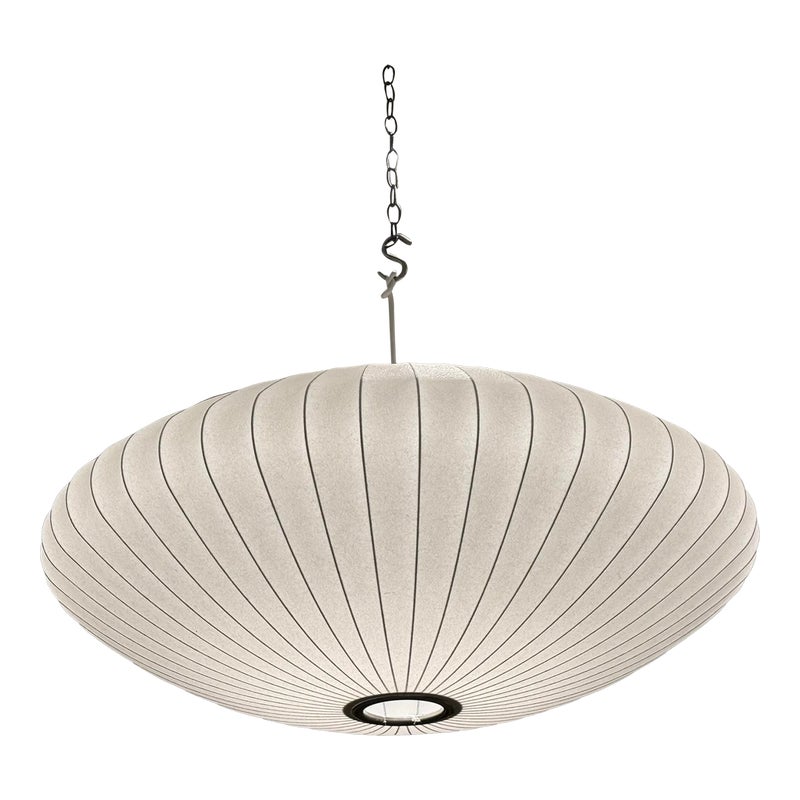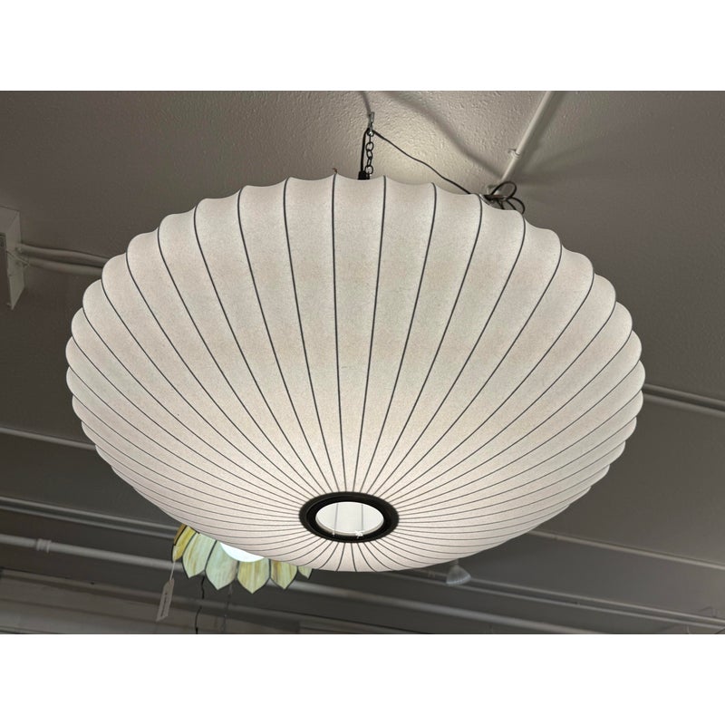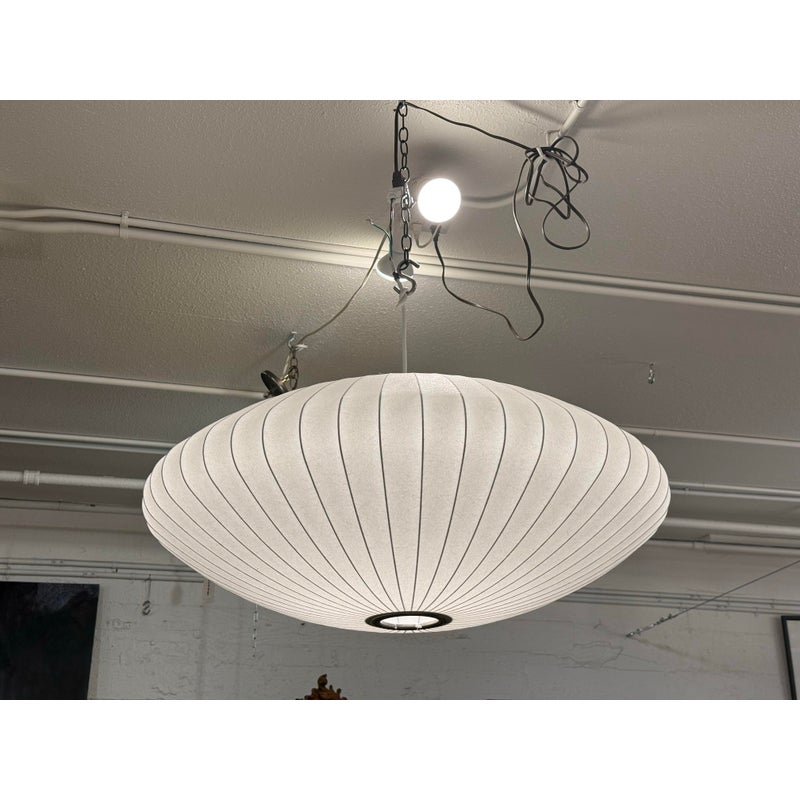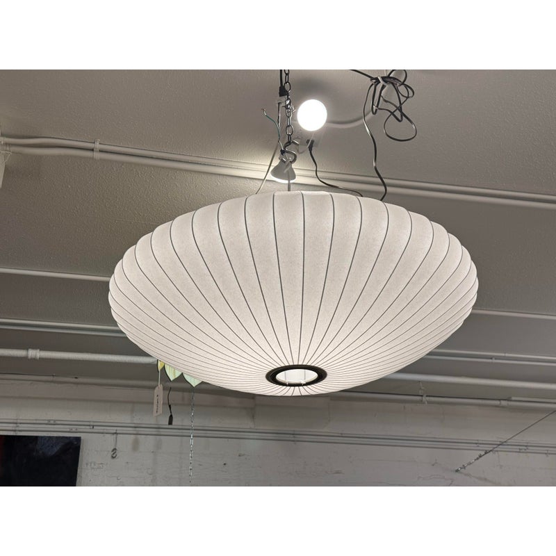 Design Plus Gallery presents the Bubble Saucer from Herman Miller. Designed by George Nelson. With its disc-like shade accentuated with thin vertical lines, the Nelson Saucer Bubble Pendant (1952) plays with shape and geometry. Designed to float delicately overhead, this saucer-shaped hanging pendant light will make your room feel out of this world. It is in good condition with minimal visible wear for its usage.