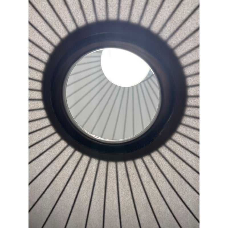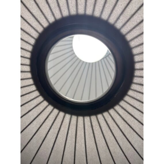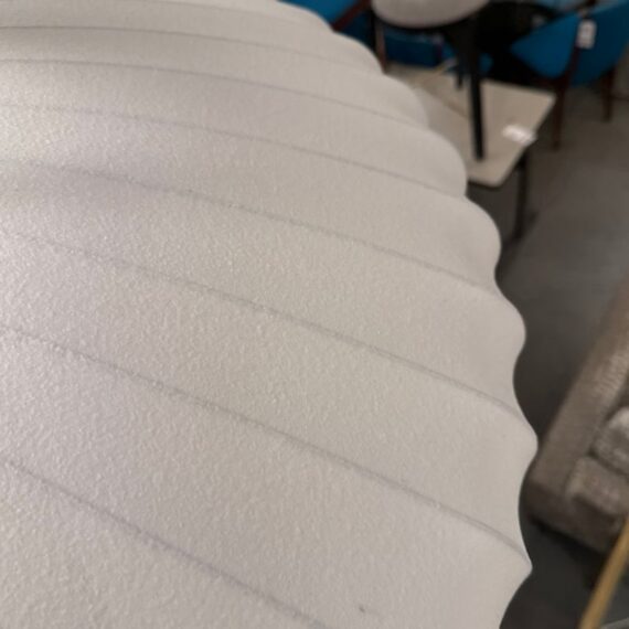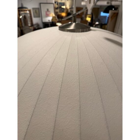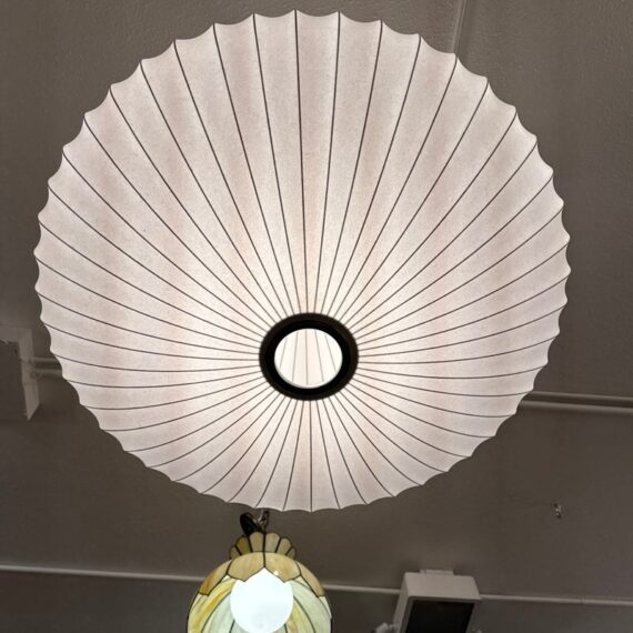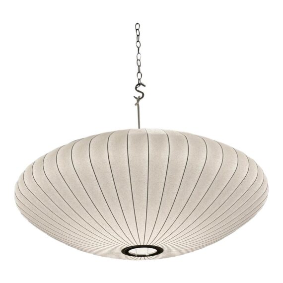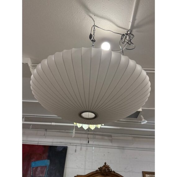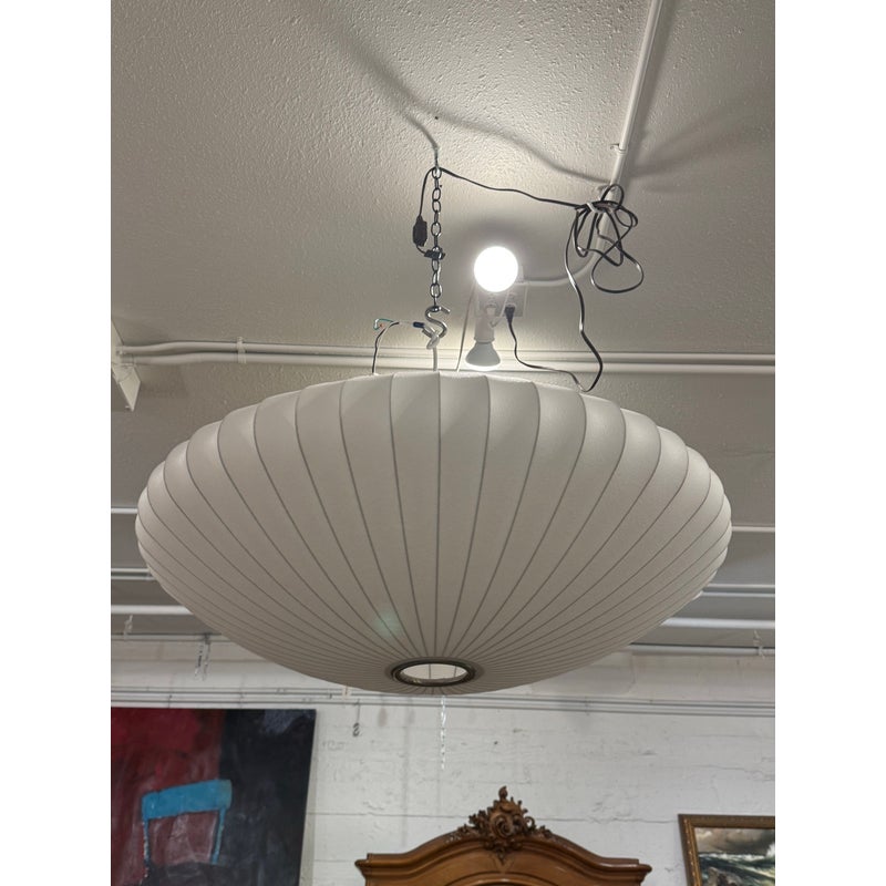 Design Plus Gallery presents the Bubble Saucer from Herman Miller. Designed by George Nelson. With its disc-like shade accentuated with thin vertical lines, the Nelson Saucer Bubble Pendant (1952) plays with shape and geometry. Designed to float delicately overhead, this saucer-shaped hanging pendant light will make your room feel out of this world. It is in good condition with minimal visible wear for its usage.
