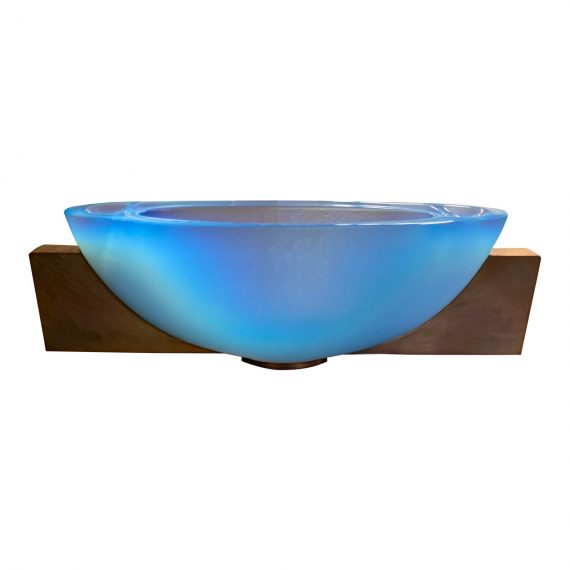 Design Plus Gallery presents a “Wing” Bowl Sculpture by artist George Whitfield Bucquet. An oval bowl made of hot cast glass in a luminous blue that makes you think you are staring out into the Mediterranean Sea. This work of art is cradled in bronze tone cast copper “wing” frame. A stunning piece for any room.