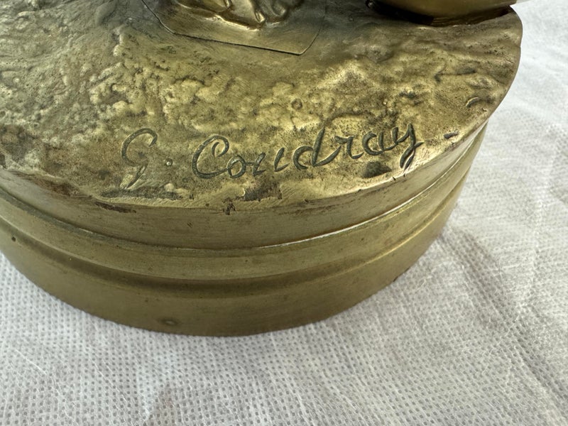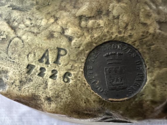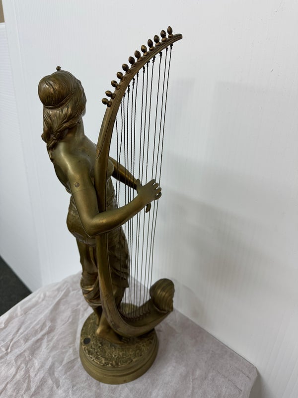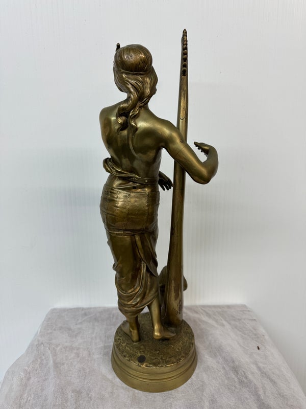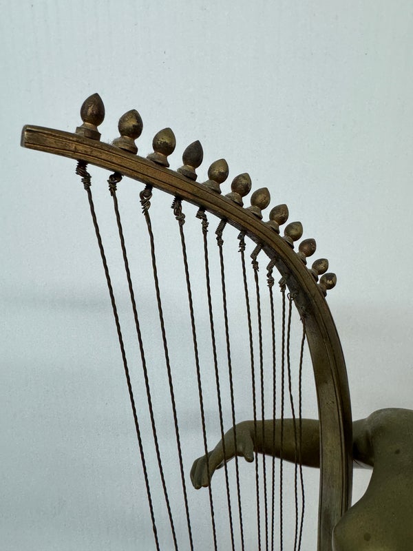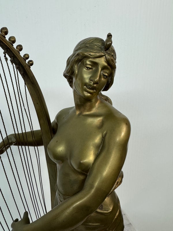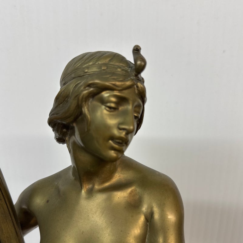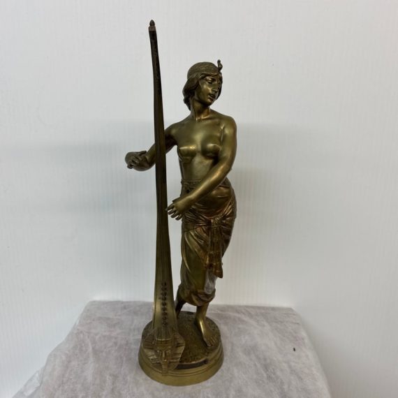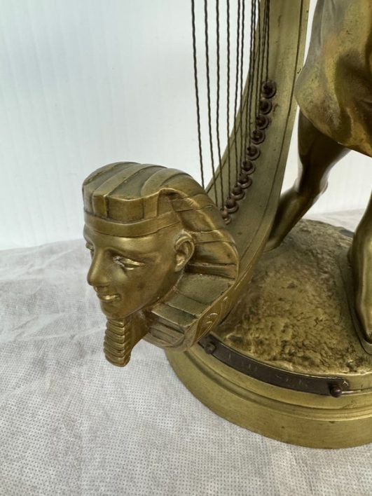 Design Plus Gallery presents “Those” The Egyptian Harp Player Bronze figure by Georges Charles Coudray (1863 – c.1932). The subject was inspired by the novel “Book of the Mummy” by Théophile Gauthier, a 1863 historical novel set in Ancient Egypt. The original was exhibited in the Paris Salons in 1892. This exquisite sculpture is signed “Coudray AP” and bears the seal of the Societe des Bronzes de Paris foundry mark. Light surface wear; condition is good.