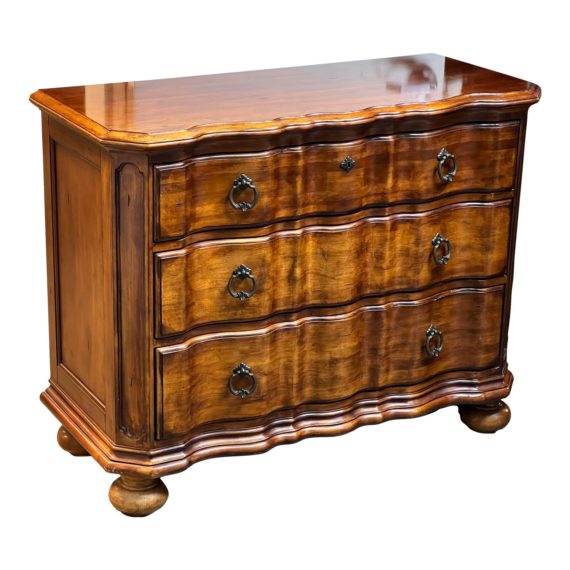 Design Plus Gallery presents a Chest of Drawers in the Georgian Style. The curved drawers have double antique brass pull rings on each of the staggered size drawers. Serpentine front with three matching drawers configured with high quality wood veneers. Faux keyhole. Is in good condition for it near vintage age. Made in China.