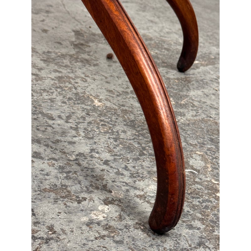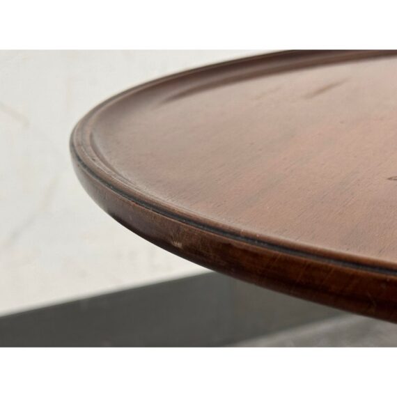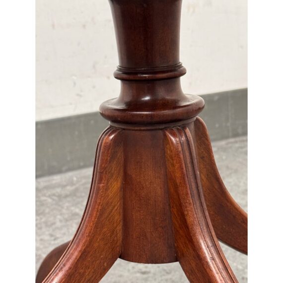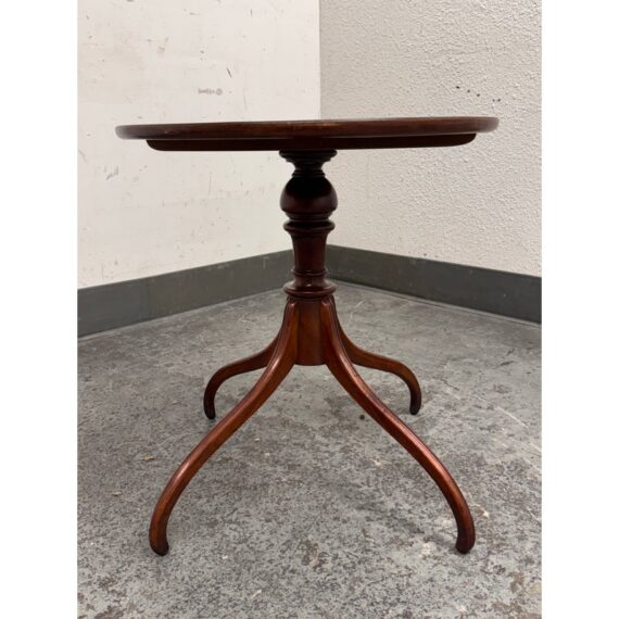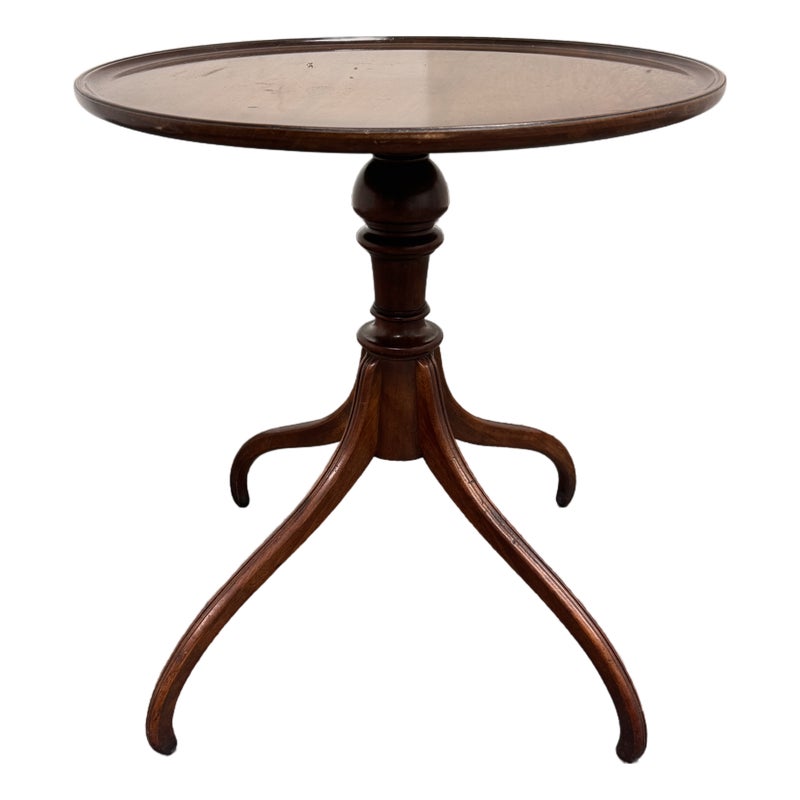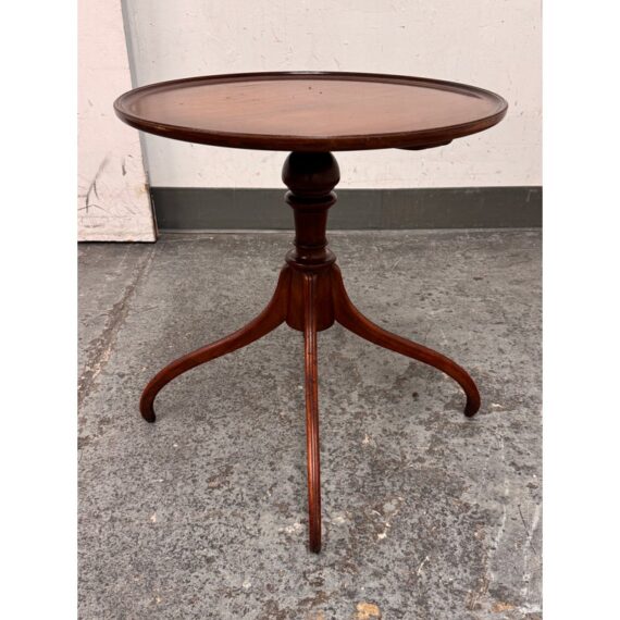 Design Plus Gallery presents a Vintage Georgian Style Mahogany Side Table. The round top is detailed with a raised lipped edge above a central turned pedestal base ending in four legs with graceful curvature. The mahogany shows appealing tonal variation and visible grain throughout, while the classic Georgian style gives the table a poised, traditional character. It is in good condition with visible and minimal wear from usage.