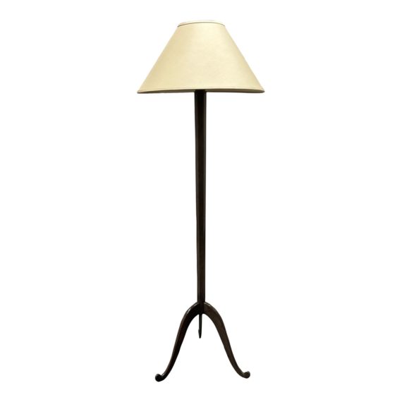 Design Plus Gallery presents a Floor Lamp by Gerald Thurston. A stunning Mid-century modern piece that seamlessly blends form and function. Crafted from walnut wood, this lamp exudes warmth and sophistication, making it a perfect addition to any living space or office. Three curved legs supporting a single wood pillar that rises to hold two lights and shade. The simplicity of the design is complemented by the attention to detail, such as the gentle curves and smooth finish of the wood. In good condition, minimal wear form usage + age.