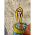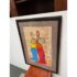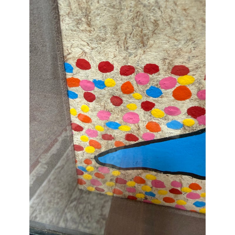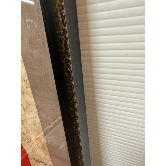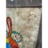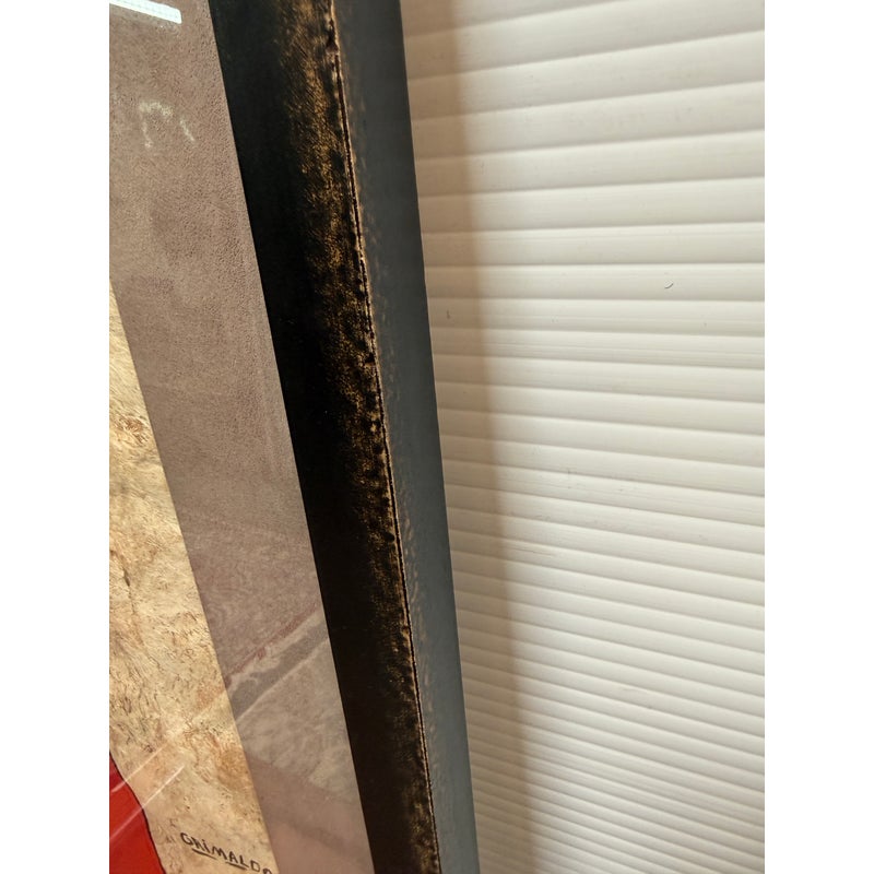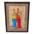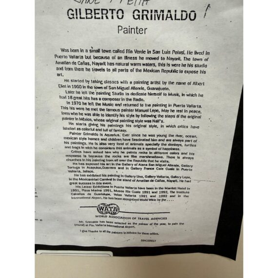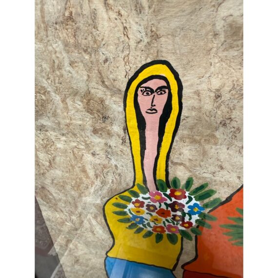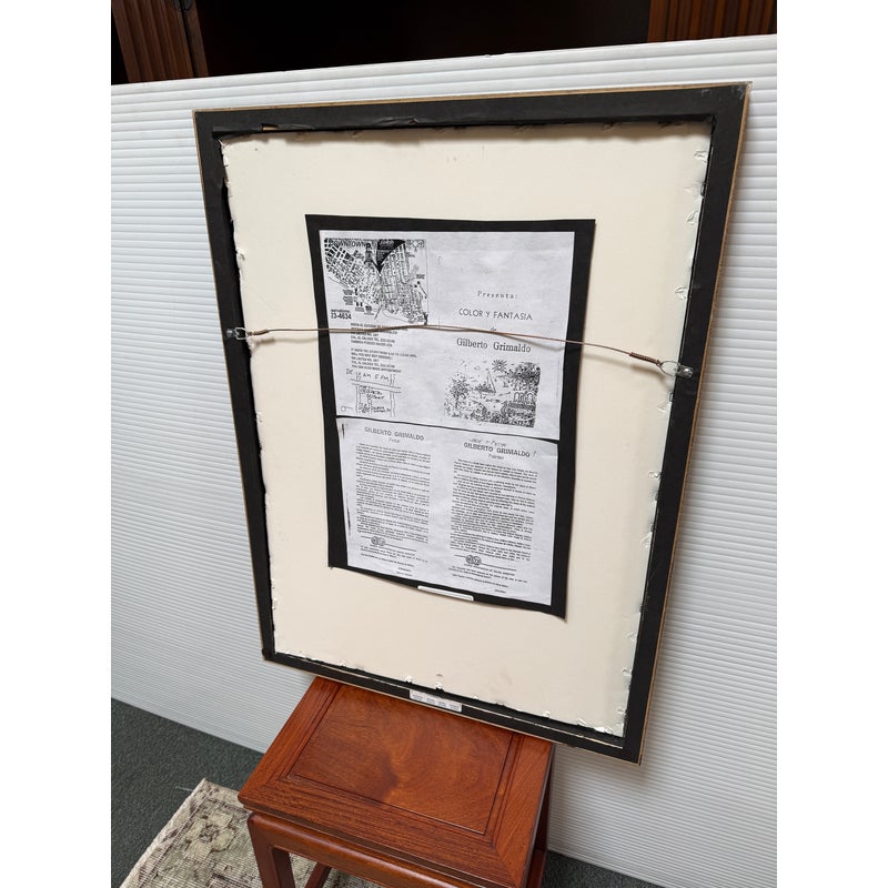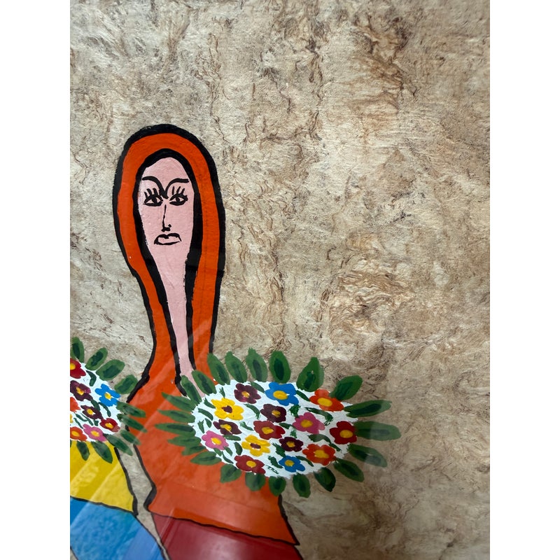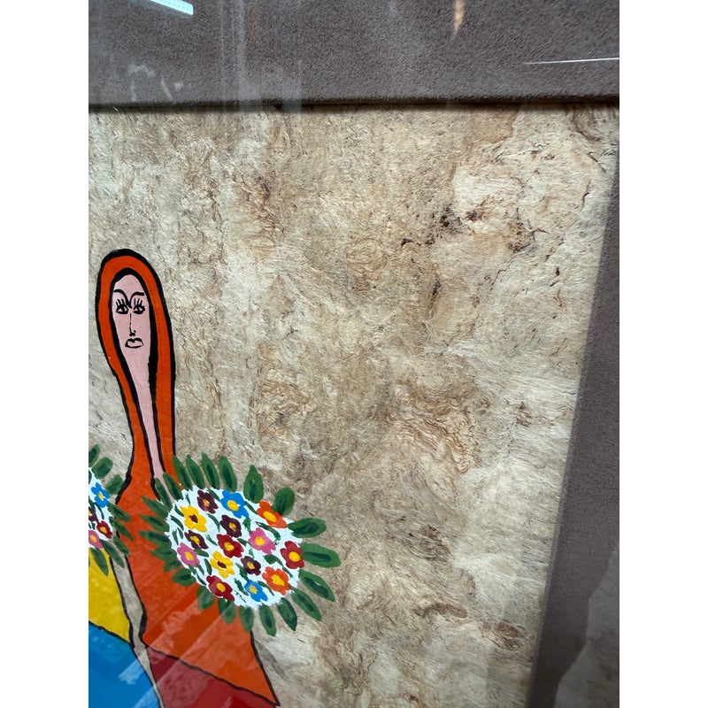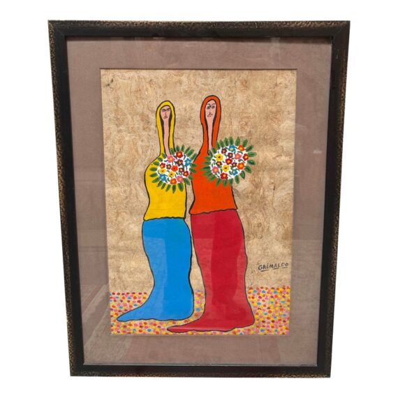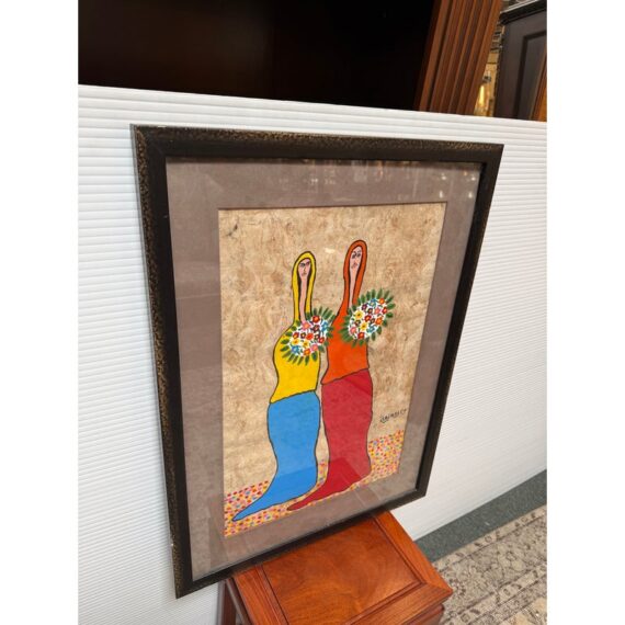 Design Plus Gallery presents a Signed Artwork by Gilberto Grimaldo. The colorful piece is pleasant and shows two female figures adorned in long shirts, one blue and one red, and hooded long sleeve tops. They are both carrying near identical and very colorful flower arrangements in their arms. The piece is done on a dark piece of papyrus and is framed in a dark brown frame with his signature in the right side. There is a write up on the artist included and taped to the back. It is in fair condition for its usage.