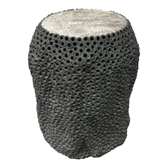 Design Plus Gallery presents Hand Pierce Stool + Fur Top by Gilles Caffier. The base stoneware in a dark finish with a cow fur seating. Signed and numbered 8/40 2013.