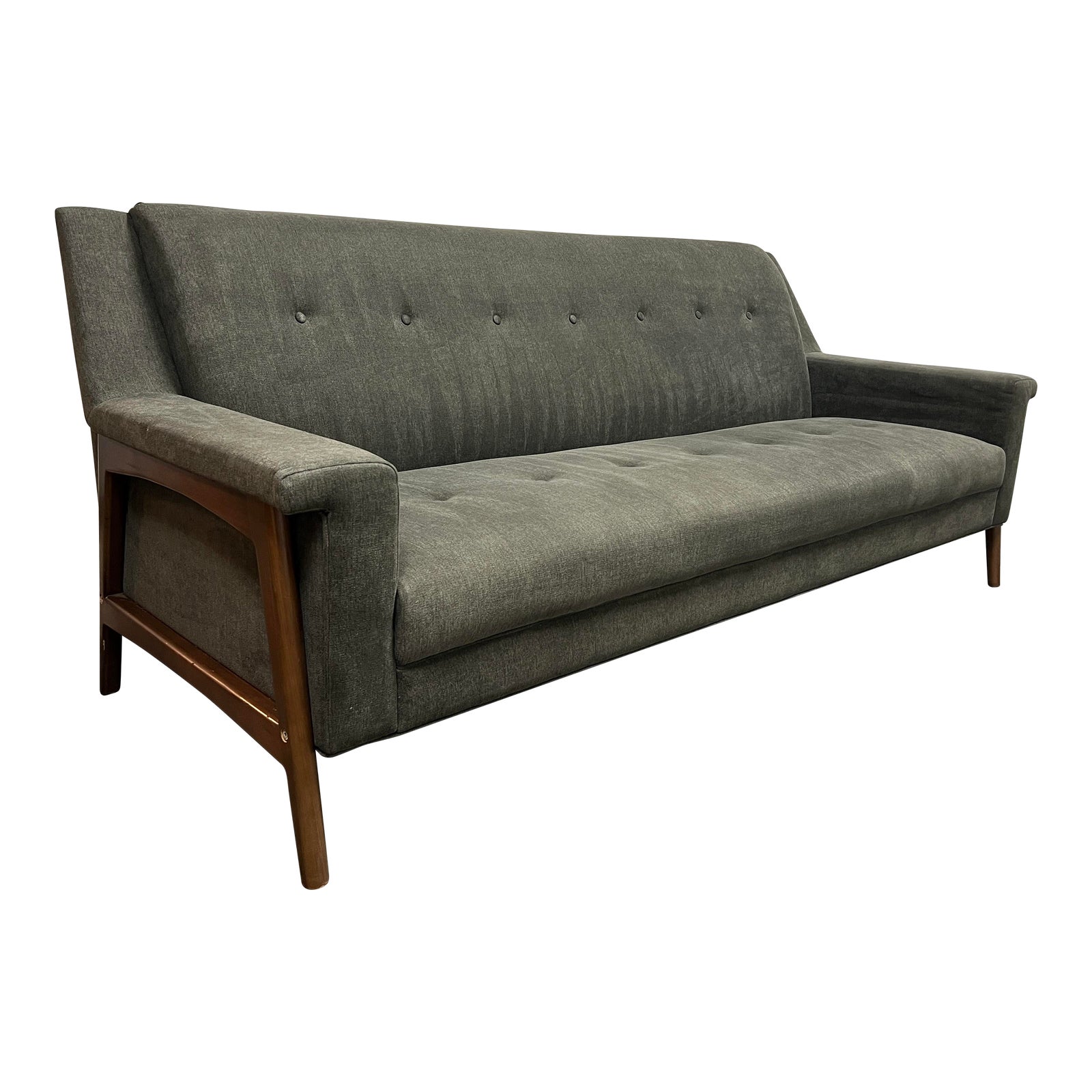 Design Plus Gallery presents a Mid Century Modern Sofa by Gingko Furniture. A nod to the designs of the Mid 20th Century. A tight back tufted framed with a sight tufted seating. Squared arms with an exposed walnut frame on the sides Upholstered in the dark gray fabric. The walnut sides have exposed hardware. Minor wear from usage.