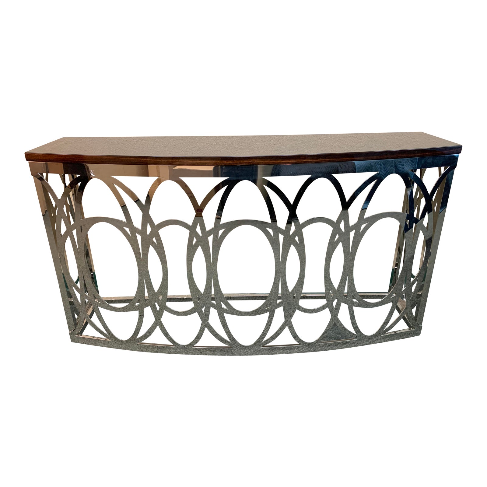 Design Plus Gallery presents the Luna Console from Giorgio Collection. Stunning laser cut polish stainless base is topped with exquisite ebony Macassar veneer for a fabulous effect. Beautiful drama in entryway, behind sofa or as a display option.