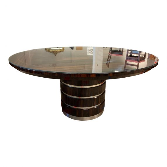 Design Plus Gallery presents a Round Table by Giorgio. From the Luna Collection. A round dining table with inlay top in Ebony Makassar with 6mm filet in Zebra veneer in high gloss polyester. Brushed and chrome stainless steel details on the table’s legs. A custom cut glass sits on top of the table. Made in Italy.