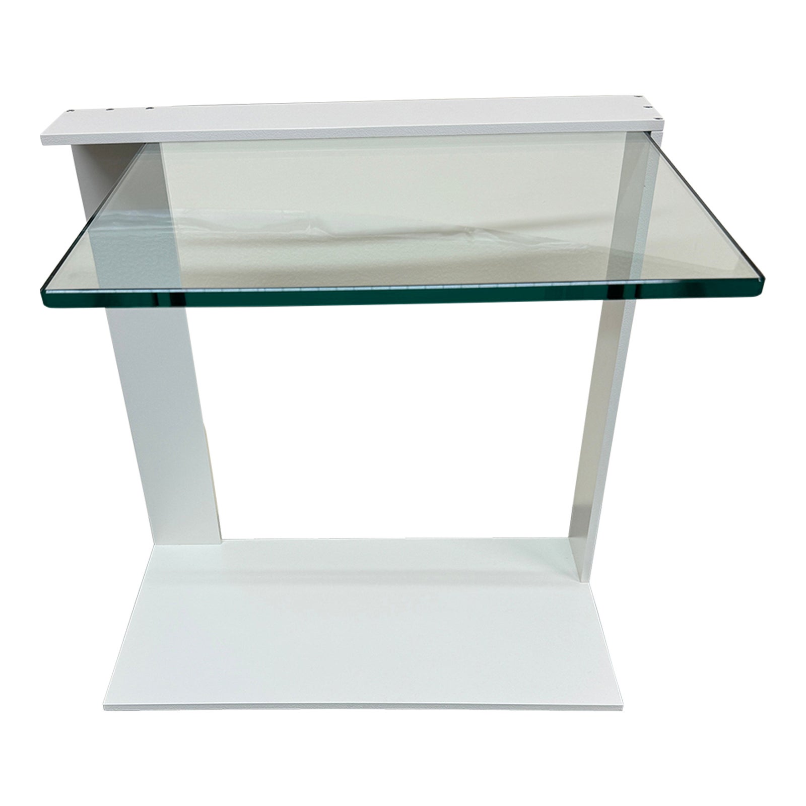 Design Plus Gallery presents a Joliet End Table by Tonelli. Designed by Giulio Mancici. A supporting metal frame in a white lacquered finish. The top, a transparent clear glass is embedded perpendicularly creating an interesting space underneath that can be exploited. With a contrast between the metal and glass, a vibrant juxtaposition is created for a complementary touch. In good condition. Made in Italy.