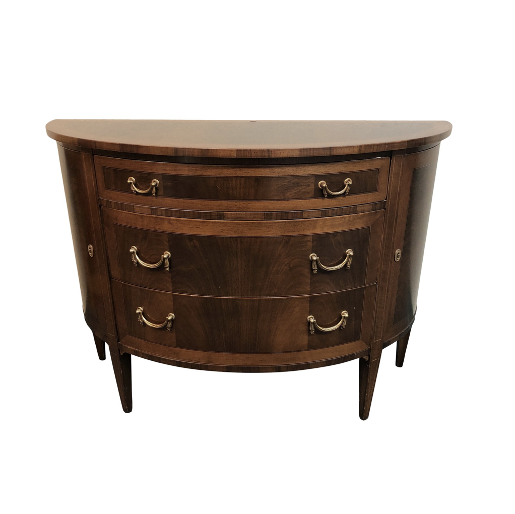 Design Plus Gallery presents a classic demilune cabinet from Italy. The lovely antique has paper lined shelves and deep, brass-handled drawers to house your treasures. The glass top protects this amazing wood grain. Original Key.