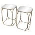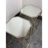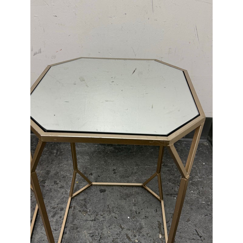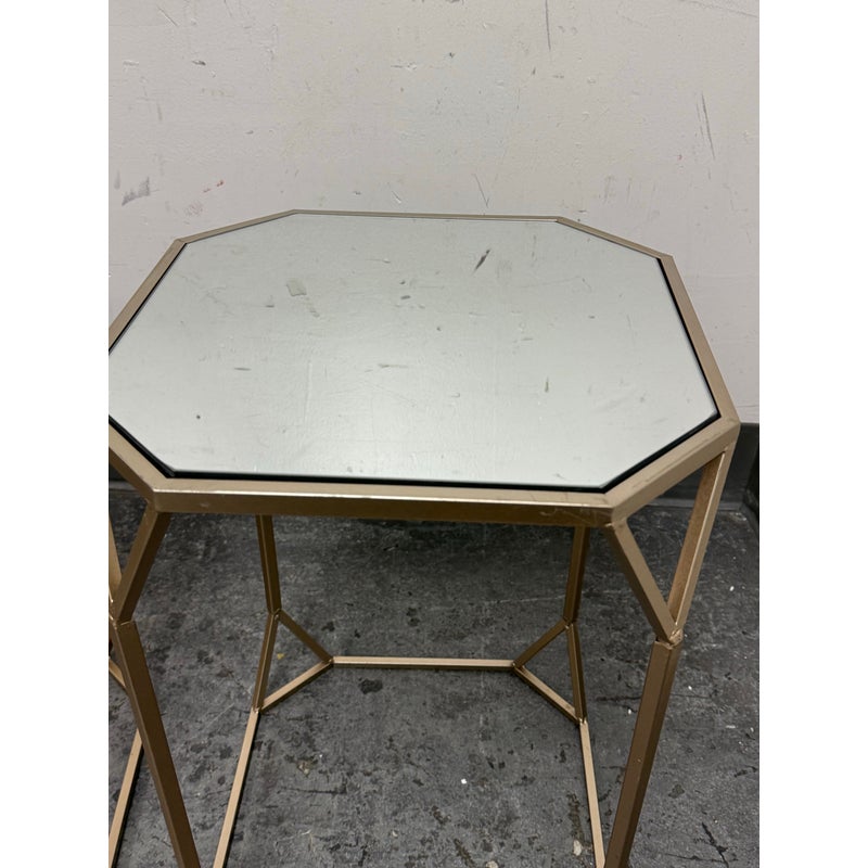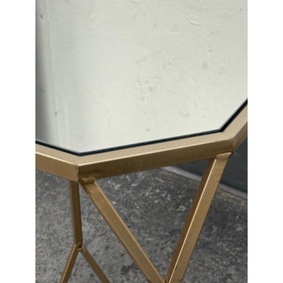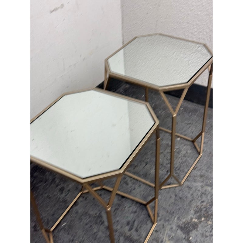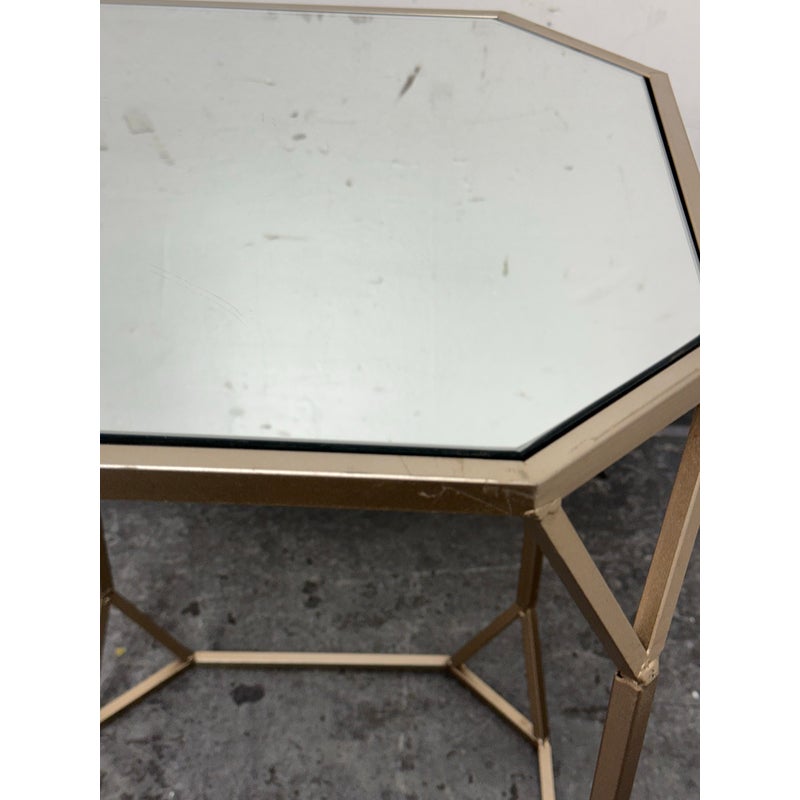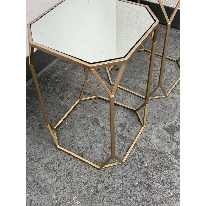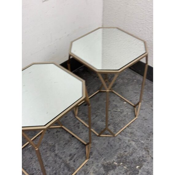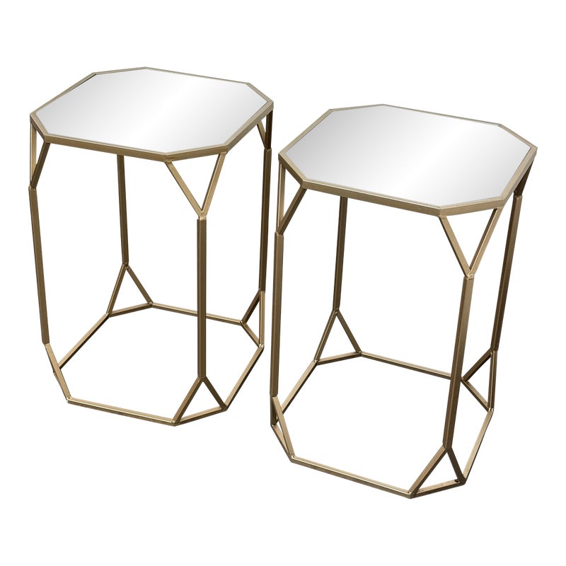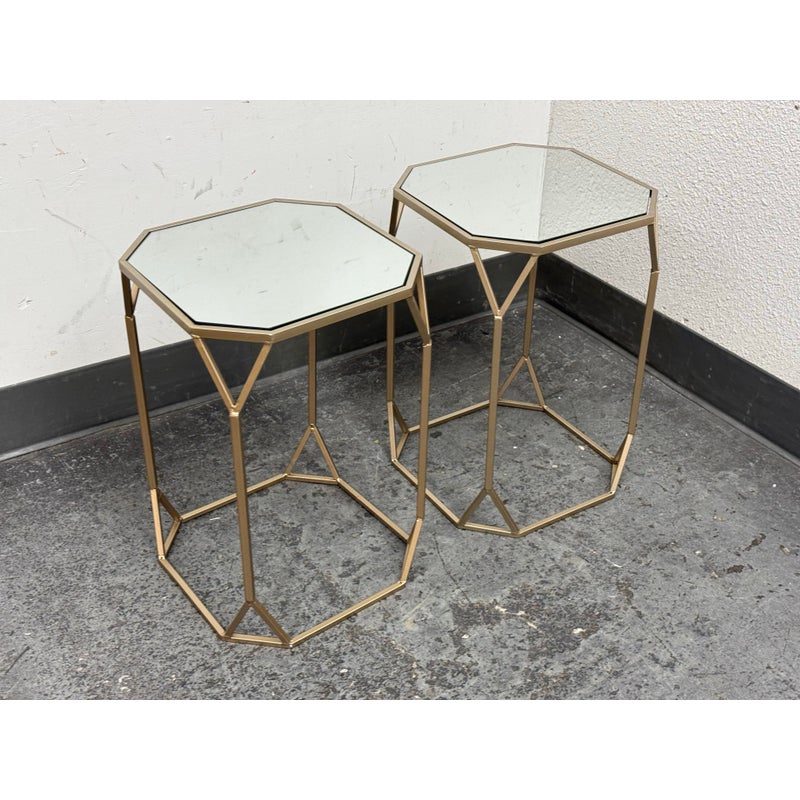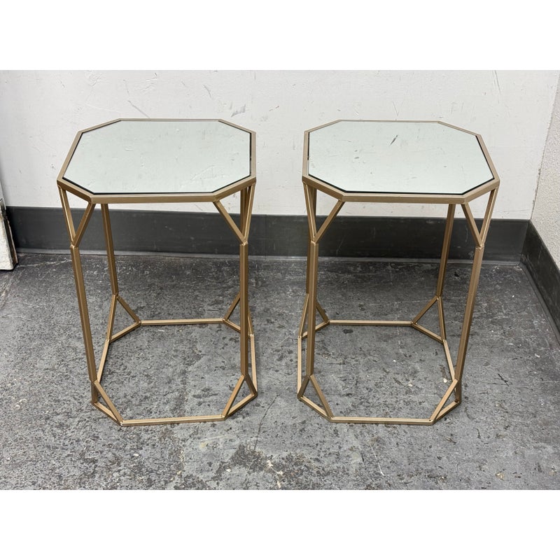 Design Plus Gallery presents a Pair of Golden Metal Side Tables from Glitzhome. Of identical sizing the table have mirrored table tops with geometric patterns around the base. In good condition with wear that is visible and consistent with usage.