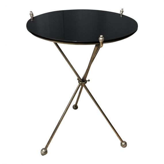 Design Plus Gallery presents a Global Views Black Marble Top Metal Tripod Base Side Table. Oiled brass base modernizes traditional details of the tripod base and top. Surface is a polished black marble and is supported by minimal brass lip. Minor wear on surfaces.