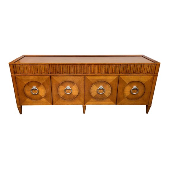 Design Plus Gallery presents a Global Views French Key Everything Cabinet. The French Key Everything Cabinet is impressive, generously scaled and multi-functional. Can be used as a media cabinet, sideboard or dresser. The doors on the left conceal two wide pull out drawers with full extension glides. The four drawers on top have touch latch self opening, full extension glides. All drawers are fully finished. The two doors on the right open to reveal an adjustable shelving. Design features solid brass hardware with a polished nickel plated finish. Minor wear through out, unit was well taken care of and is in good condition.