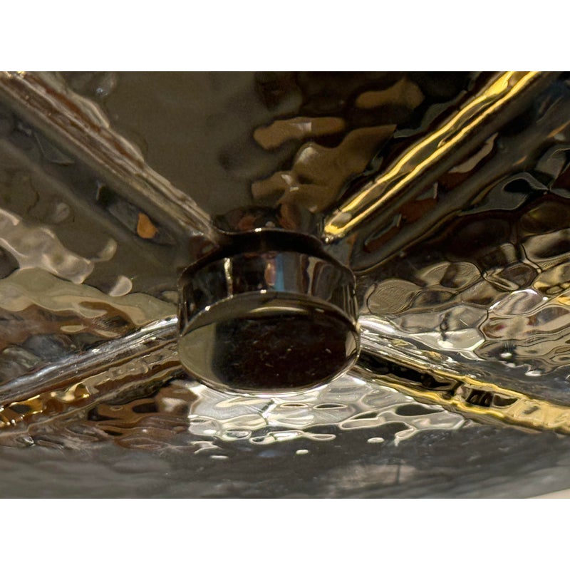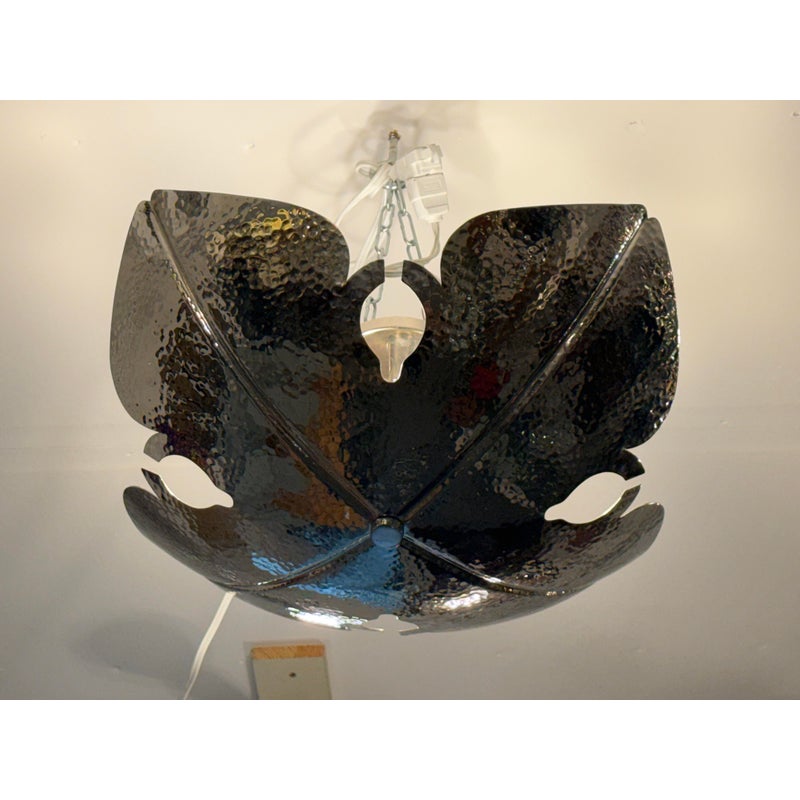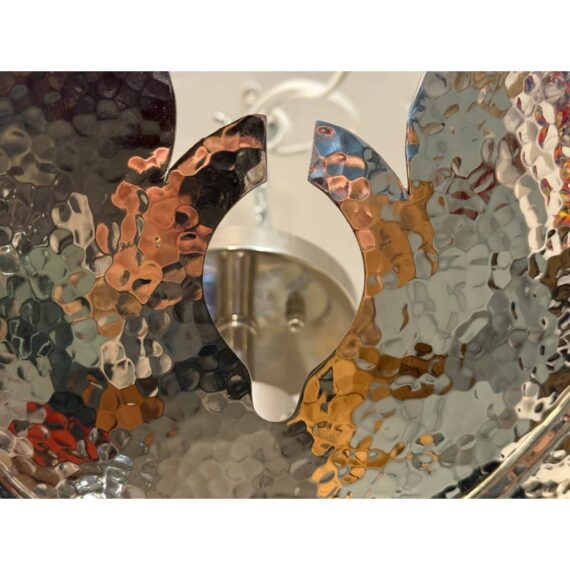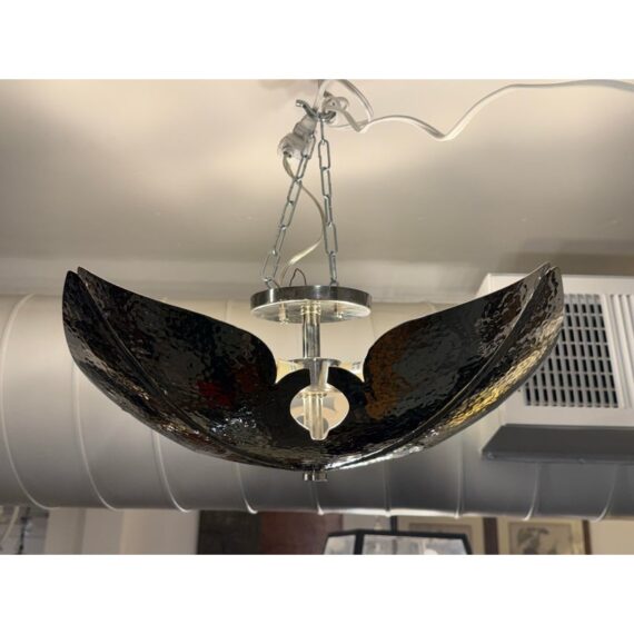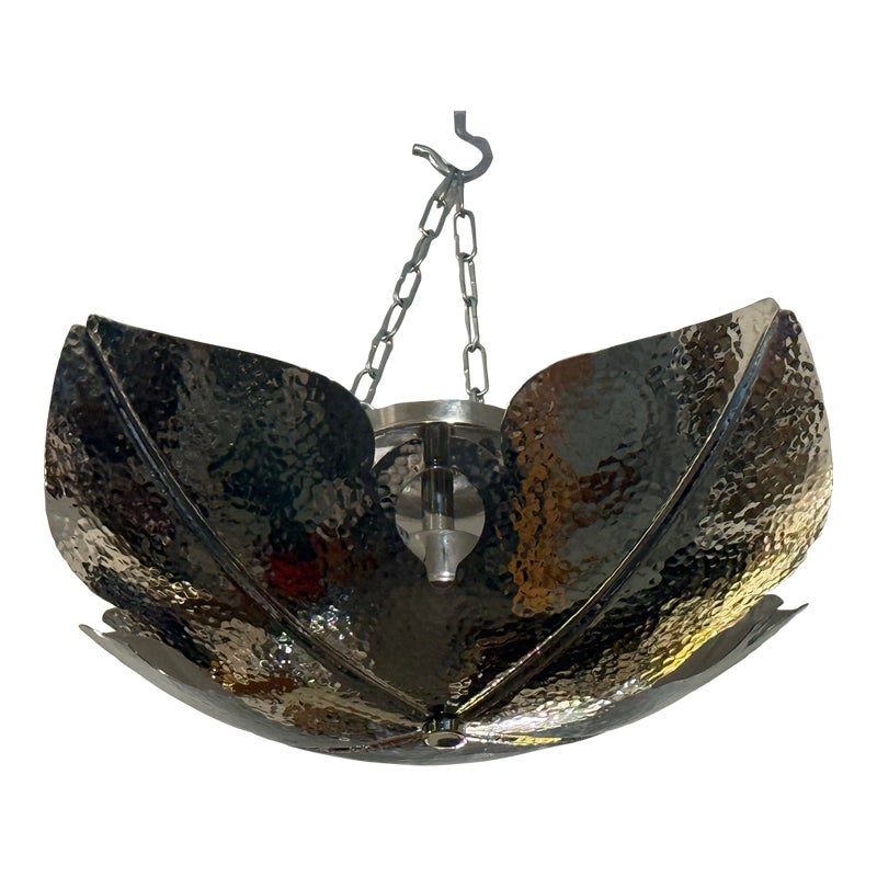 Design Plus Gallery presents a Semi Flush Mount Lotus Pendant from Global Views. Inspired by the beauty of a lotus flower, this fixture features a unique four-point design that resembles an opened blossom, making it a captivating focal point. The pendant showcases a hammered texture, which adds a deep layer of sophistication and visual interest. The dark chrome finish lends a bold, yet refined look, integrating seamlessly into a variety of decorating styles, particularly those that lean towards an organic modern aesthetic. The design includes four strategically placed lights that provide an uplifting glow, enhancing the ambiance of a space.