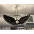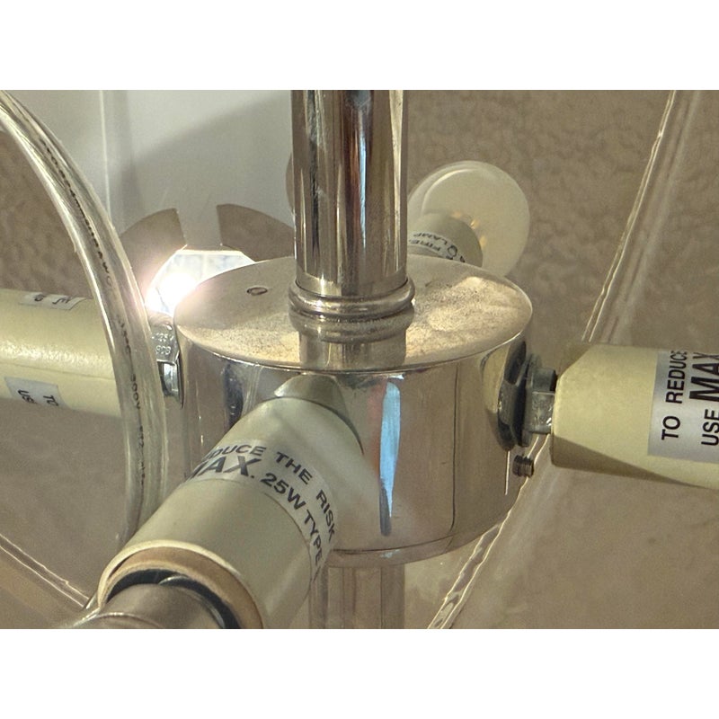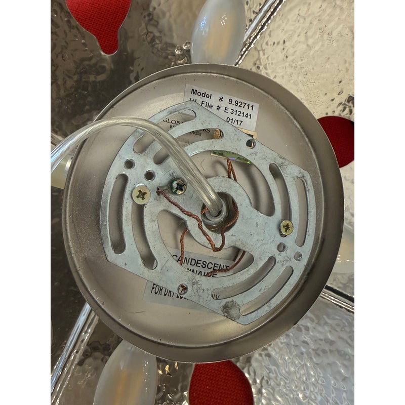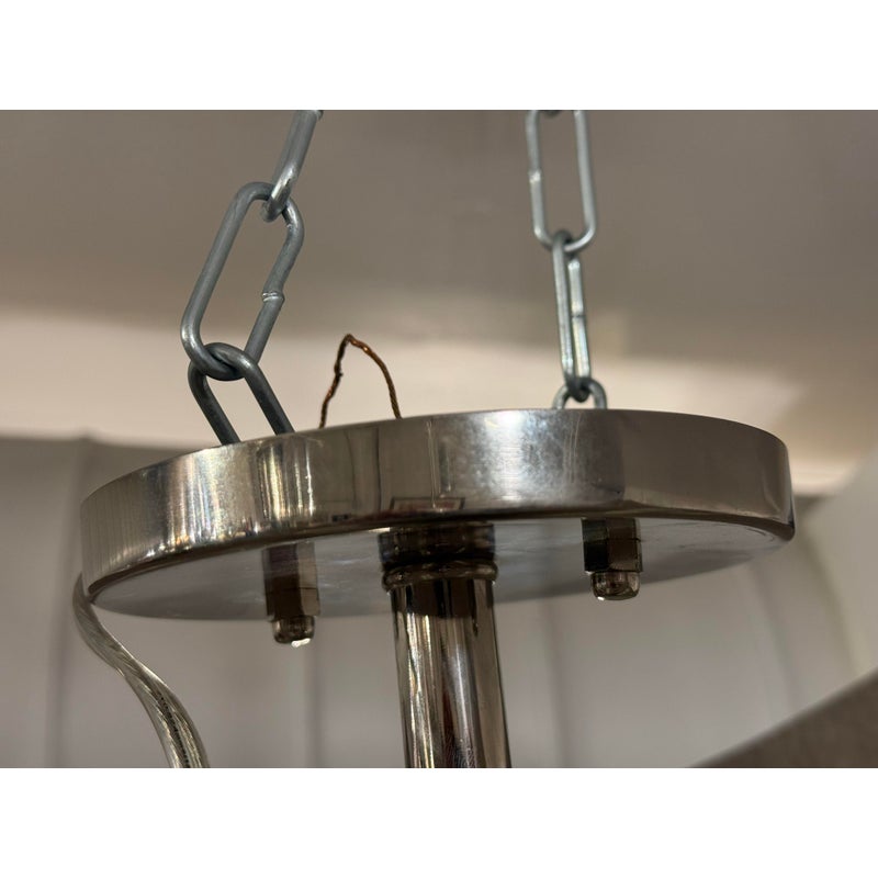 Ideal for installation in medium-sized rooms, over dining areas, or in entryways, this pendant balances the practicality of semi-flush lighting with the artistic flair of a pendant. This is a discontinued model. In good condition, visible and minimal wear from usage.