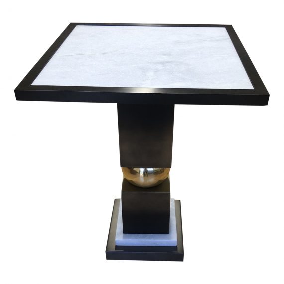 Design Plus Gallery presents a squeeze side table. Stunning! An ombre of bronze and brass finishes. The table is complimented by a weighted white marble base and bronze trimmed white slab marble top. This substantial accent table is a beautifully proportioned mix of materials.
