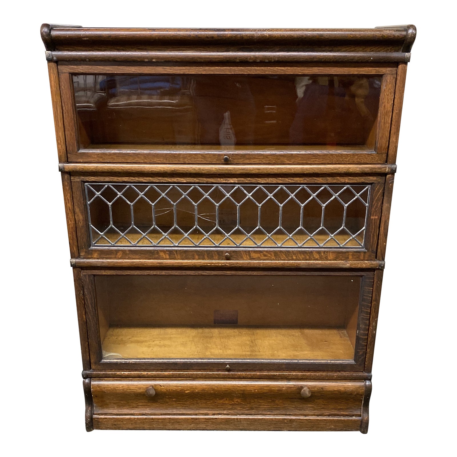 Design Plus Gallery presents an Antique Barrister Case. The beautiful oak set is composed of five separate pieces, for ease of transportation. There are three glass front cabinets, one with a leaded design (damaged), the base with drawers and the cap. There is cracks in 2 glass panels; surface wear consistent with age and use.