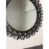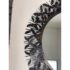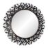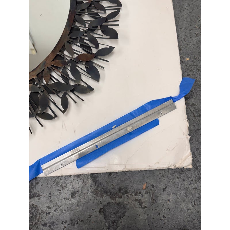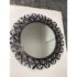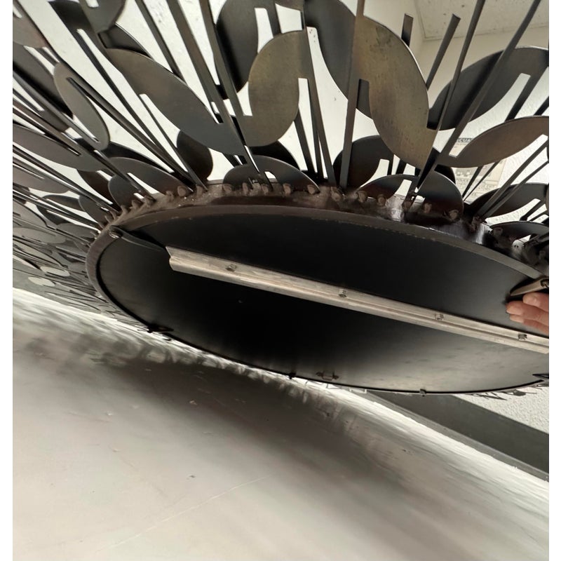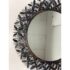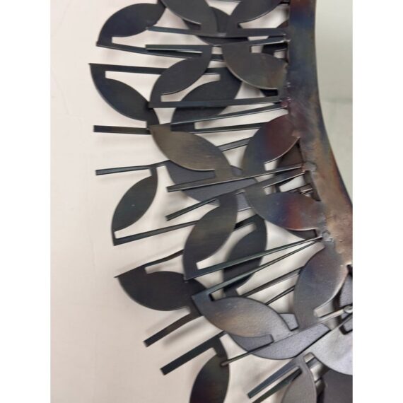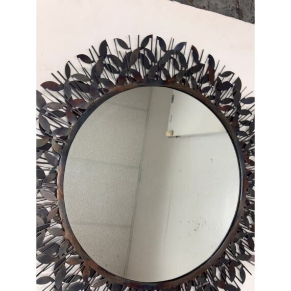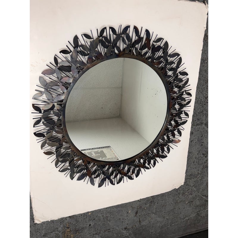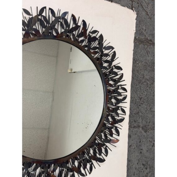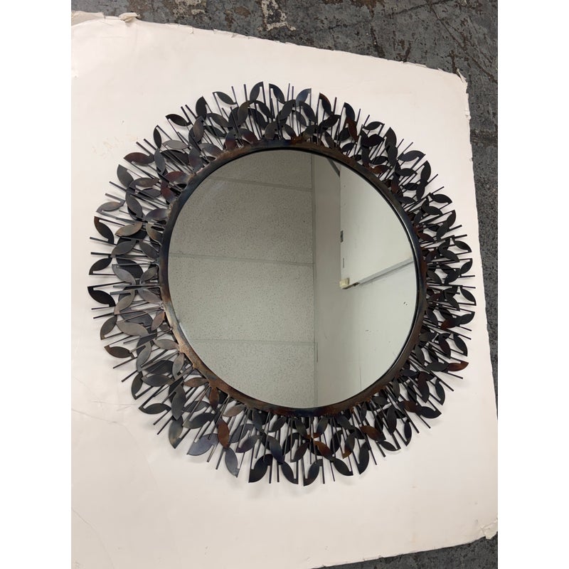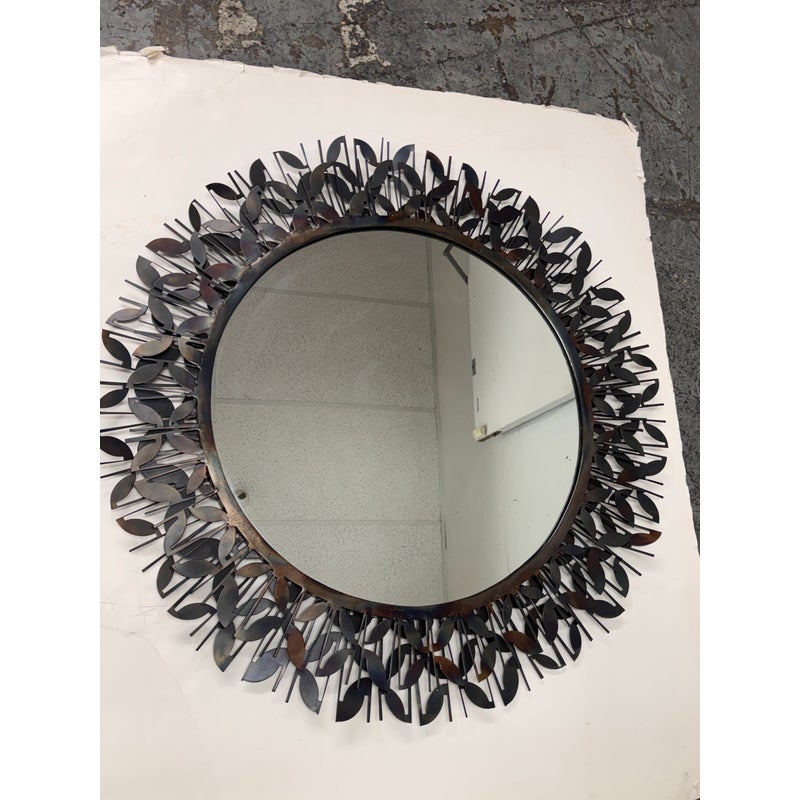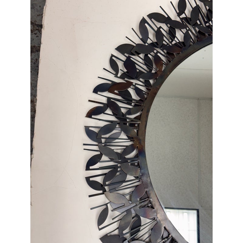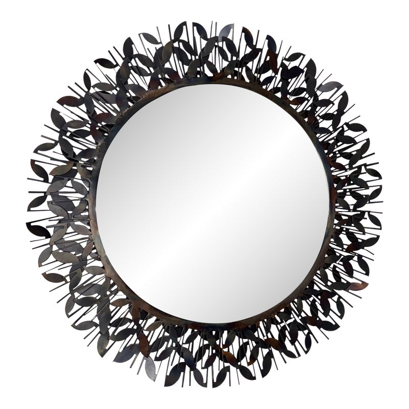 Design Plus Gallery presents the Gianna Mirror from Gold Leaf Design Group. This round wall mirror is encased in blackened iron with a sculptural ring of layered leaf motifs and slender rod accents that create a botanical frame. The metalwork shows tonal variation from the torching process, giving the frame a nuanced, smoky patina. A cleat hanger is included for secure mounting. It is in a good condition with visible and minimal wear from usage.