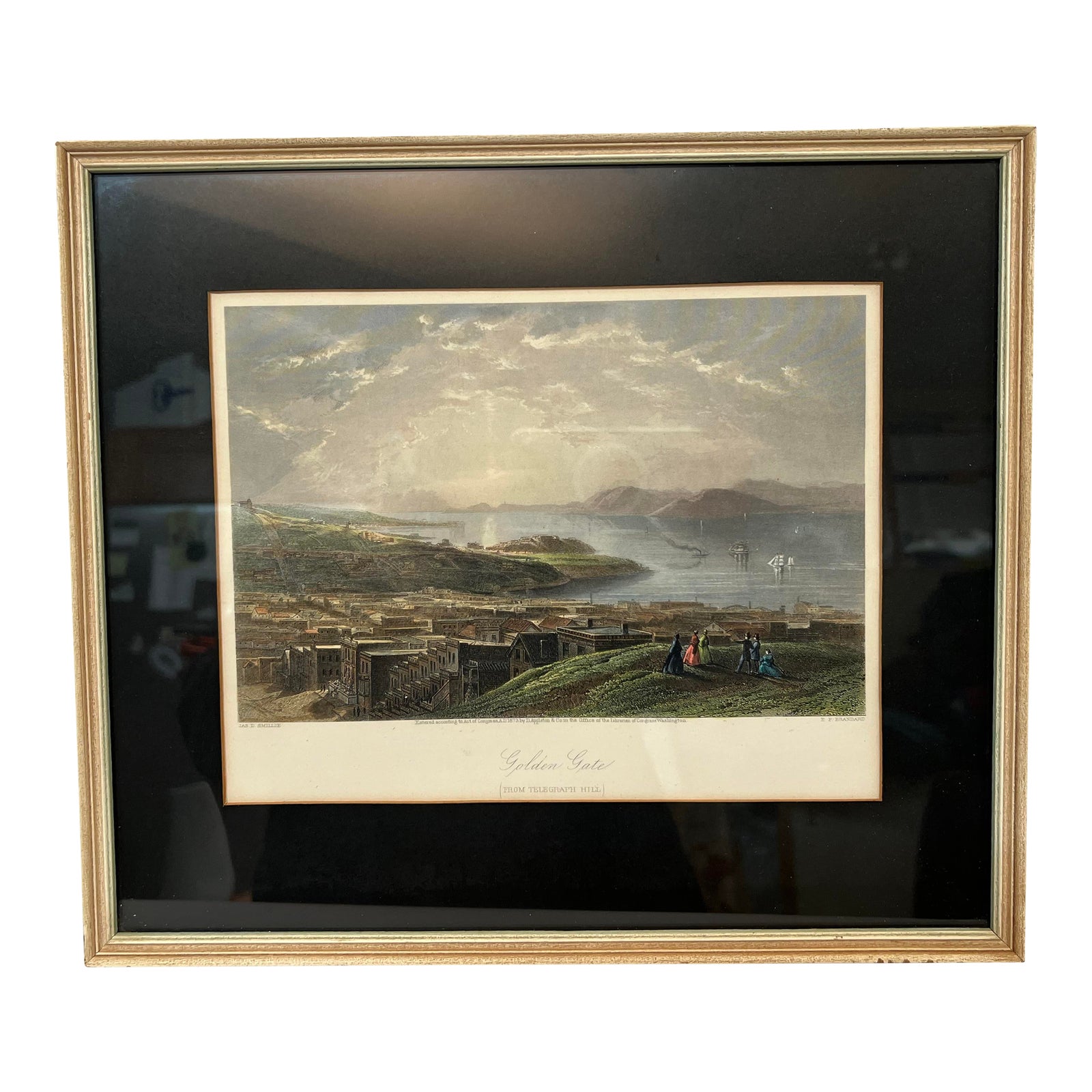 Design Plus Gallery presents the “Golden Gate, From Telegraph Hill, California” c.1873 Hand-Colored Engraving. This colorful print depicts the landscape of the Golden Gate Bay Area before the construction of the Golden Gate Bridge. Russian Hill is to the left, and the Marin peninsula to the right. A neighborhood of mostly residential buildings stretches out on the lower left of the print. Four ladies and two gentlemen enjoy the view from the green hill on the bottom right. The print was single-matted before being framed in wood. Minor wear from use; print is in good condition.