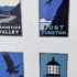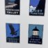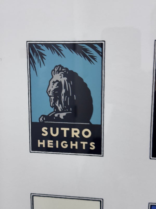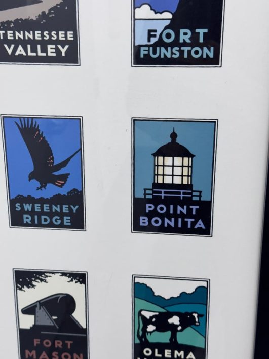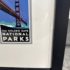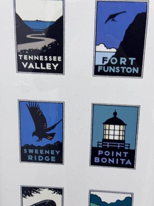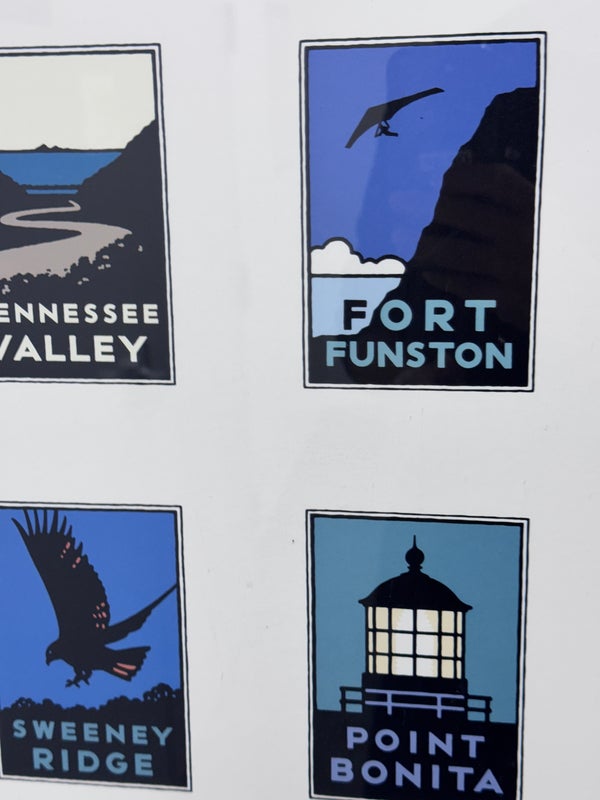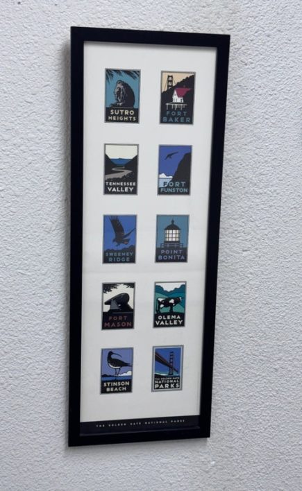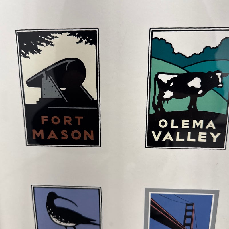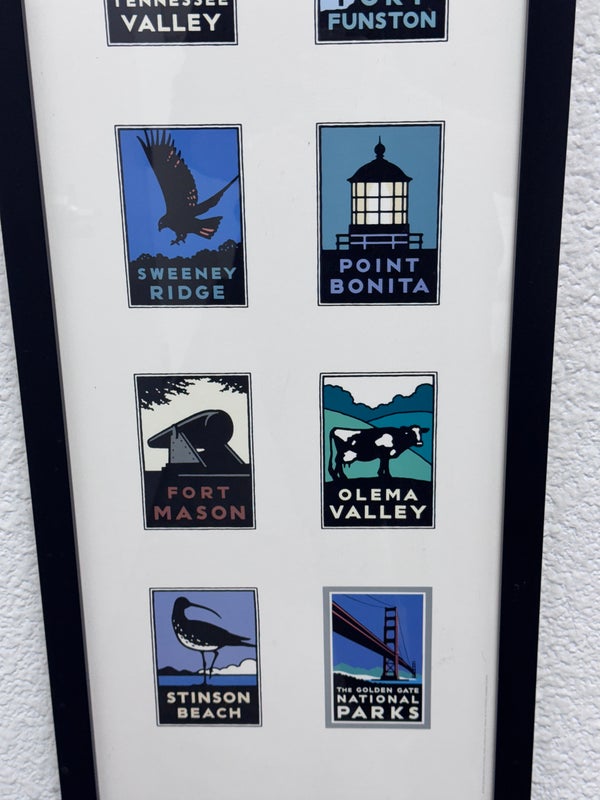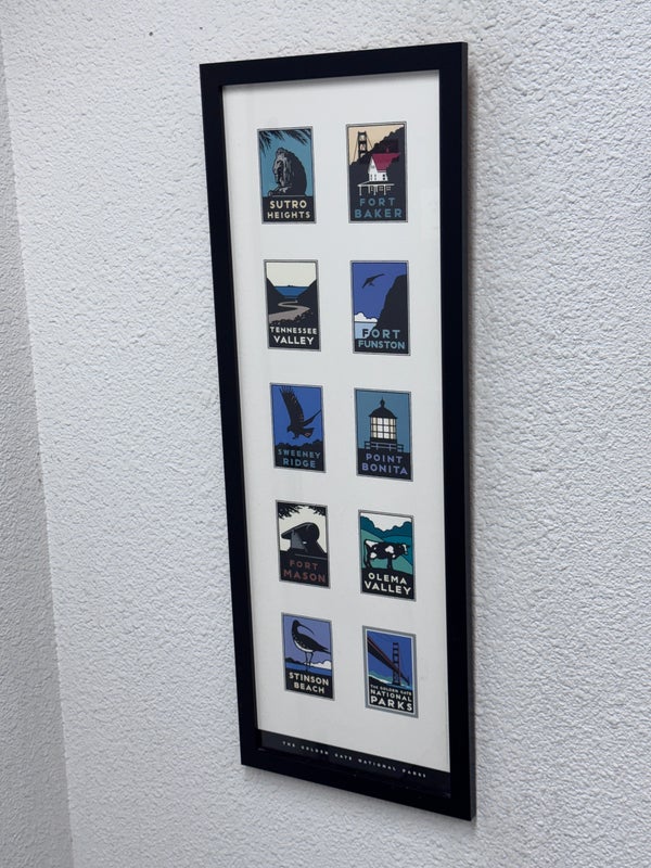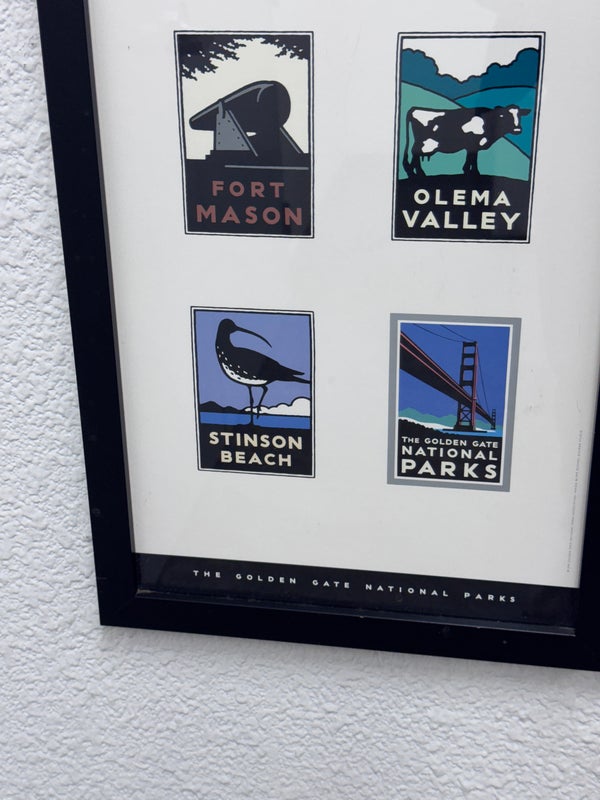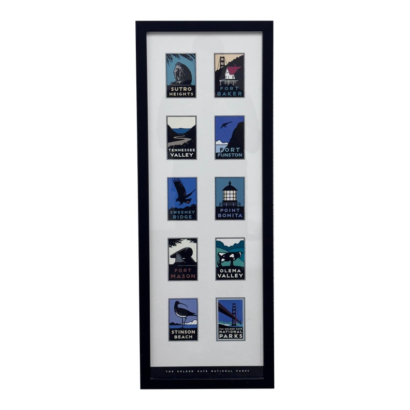 Design Plus Gallery presents a View of Ten Total Created for the Golden Gate National Recreation Area. A bold a vivid set of ten prints of the miracle of the notorious Bay Area landmarks. Sutro Heights, Tennessee Vallery, Sweeney Ridge, Fort Mason, Stinson Beach, Fort Funston, Point Bonita, Olema Valley and Marin Headlands Sky Deck View of Golden Gate Bridge. Is in a black finished frame and in good condition, minimal wear.