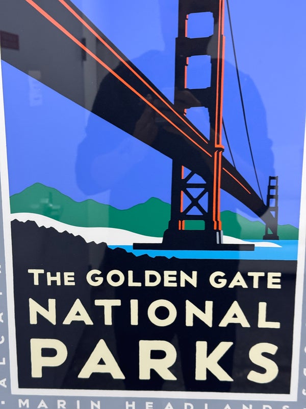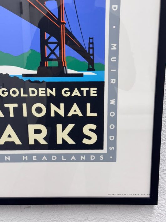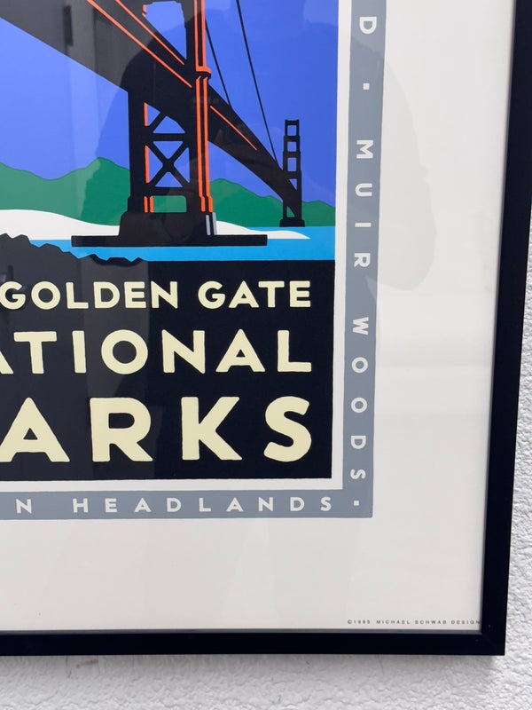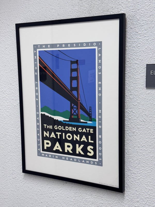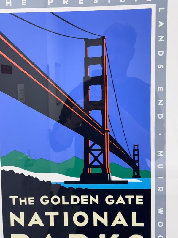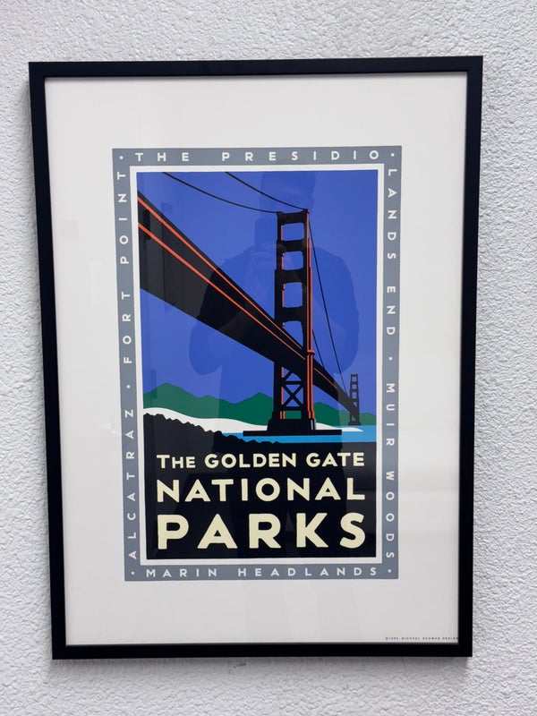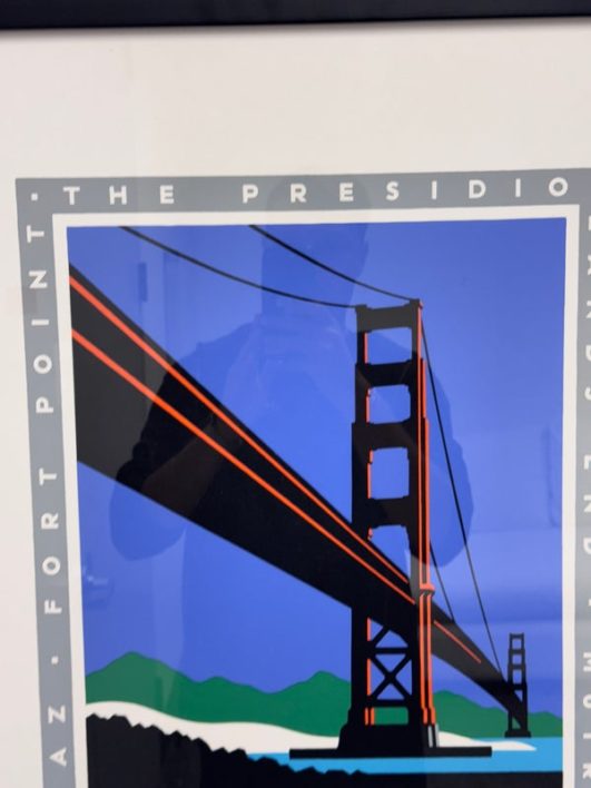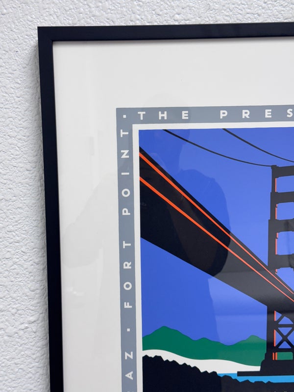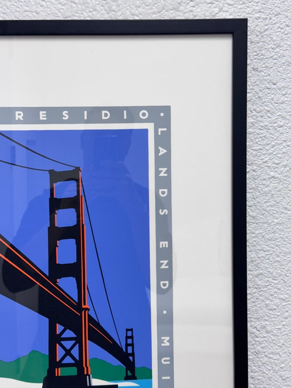 Design Plus Gallery presents the Skydeck View of the Golden Gate Bridge from the Golden Gate National Recreation Area. A bold a vivid print of the miracle of the notorious SF bridge from the Marin Headlands viewpoint. Its framed and in good condition.