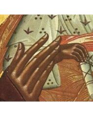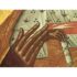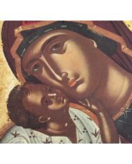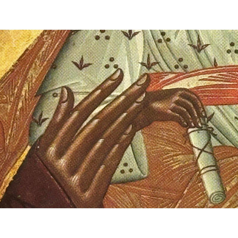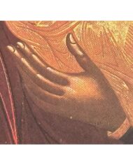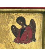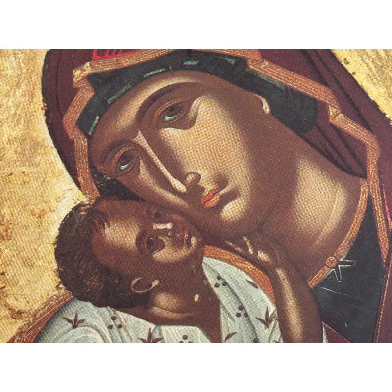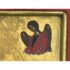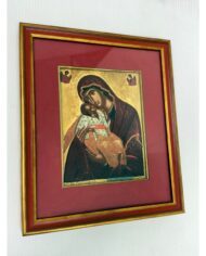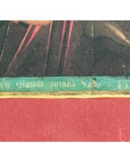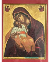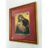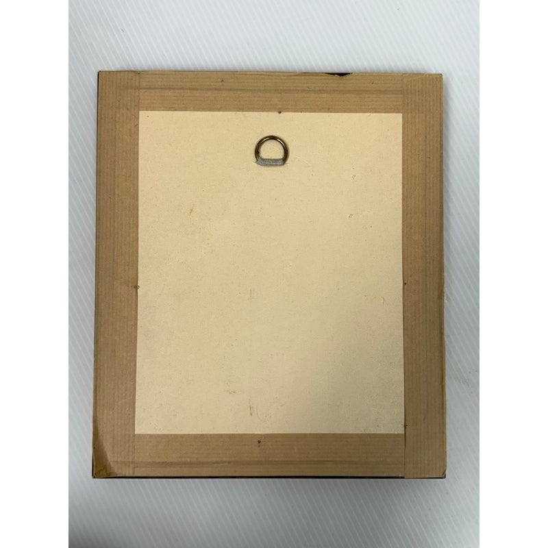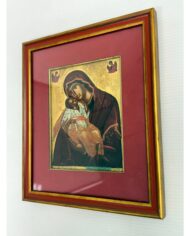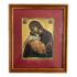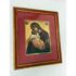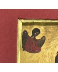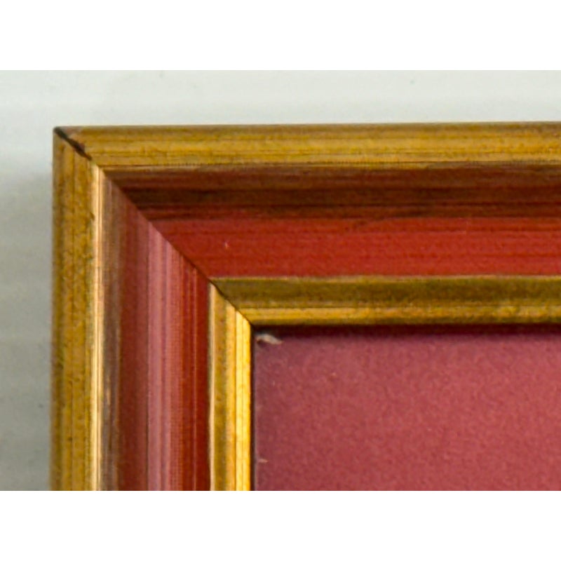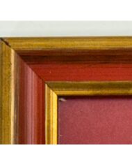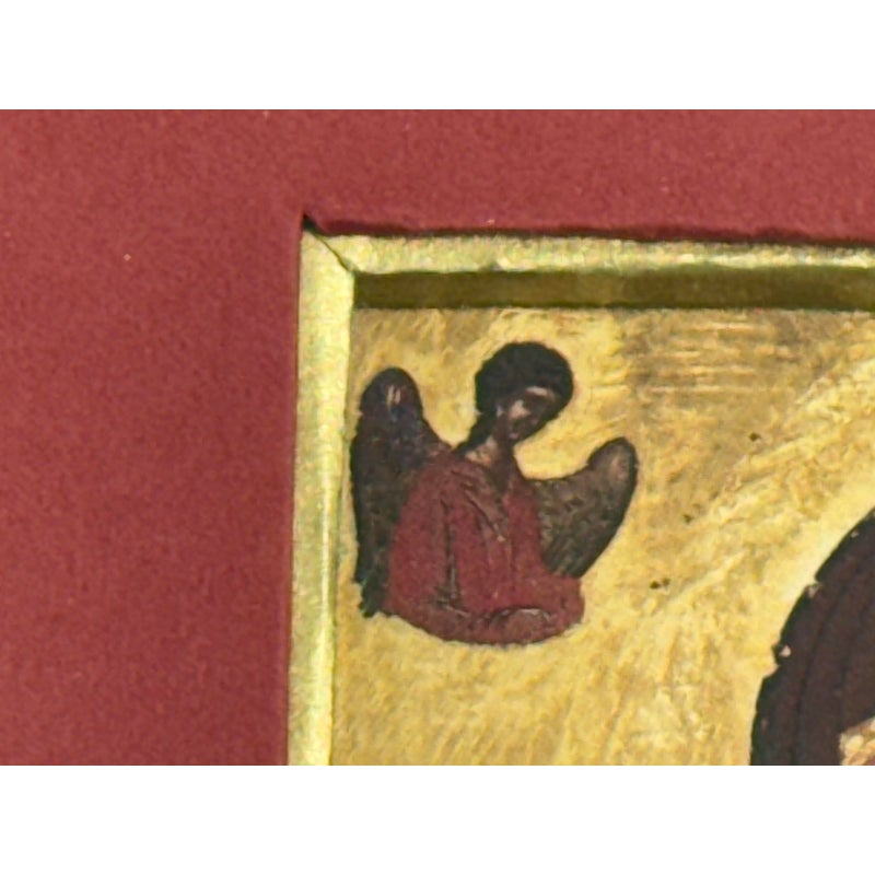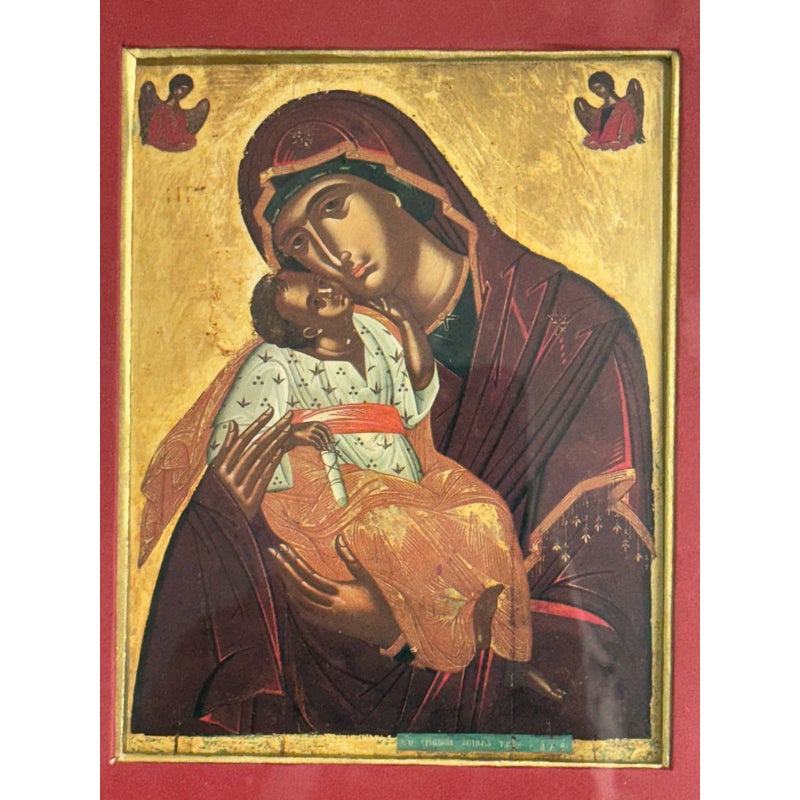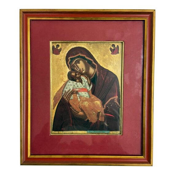 Design Plus Gallery presents A Golden Artwork of the Madonna with Child in Red Matte with Red + Gold Frame. There are two angels in the top two corners with Madonna having her cheek to child. The art piece is striking even with its small scale. Is in good condition for its age with minimal surface wear that is consistent with use.