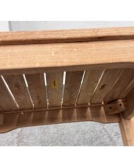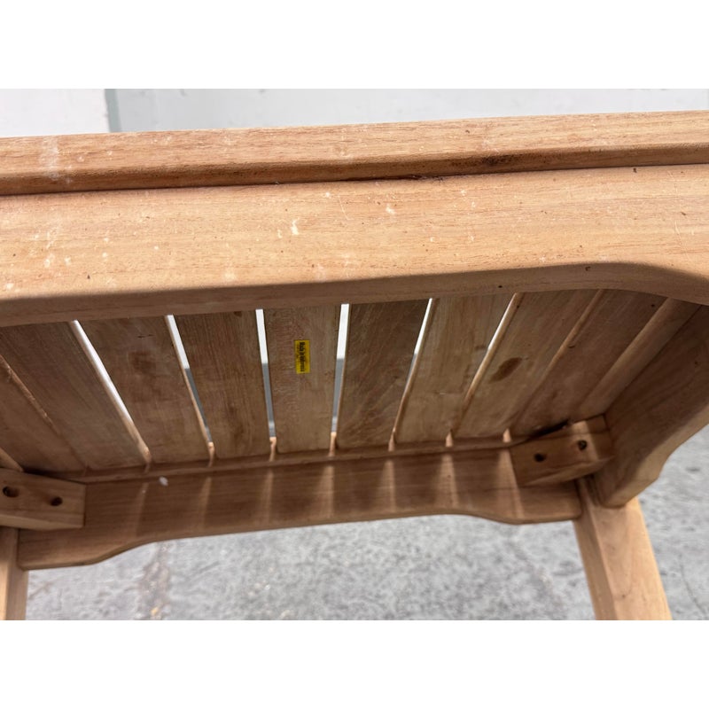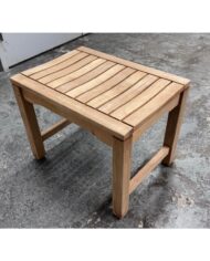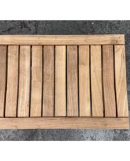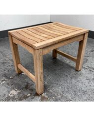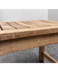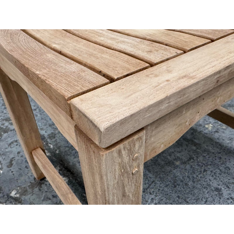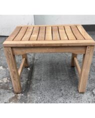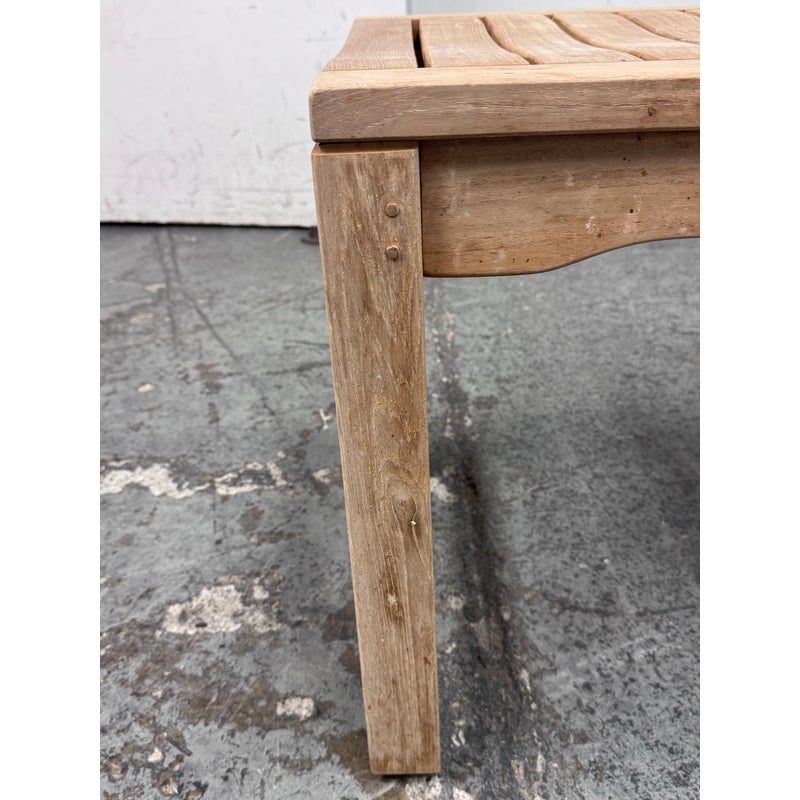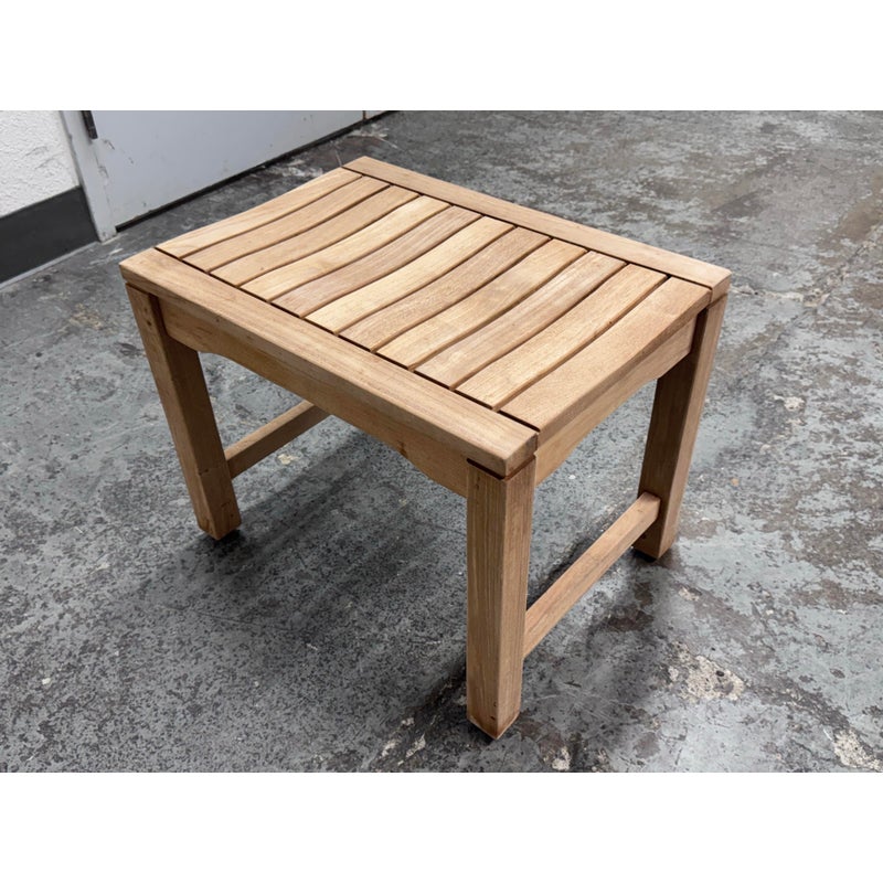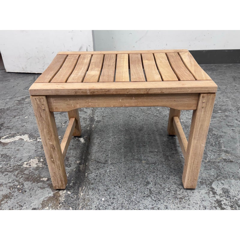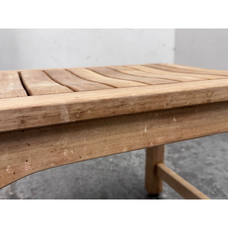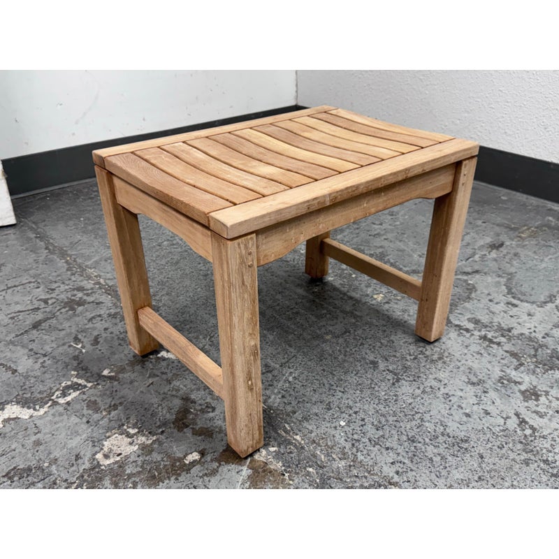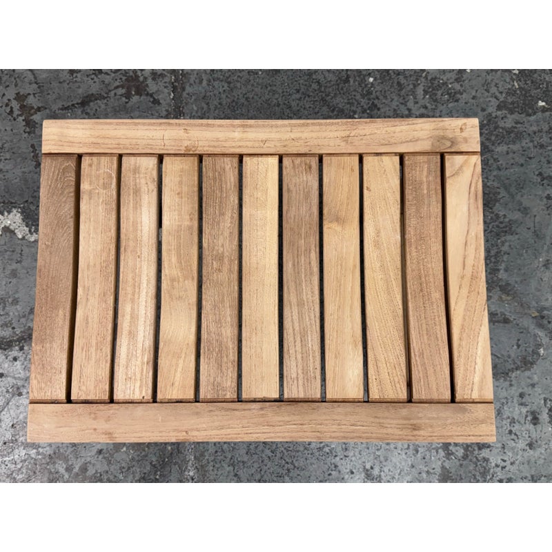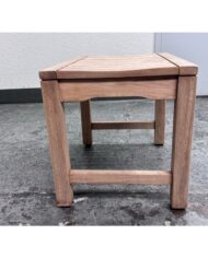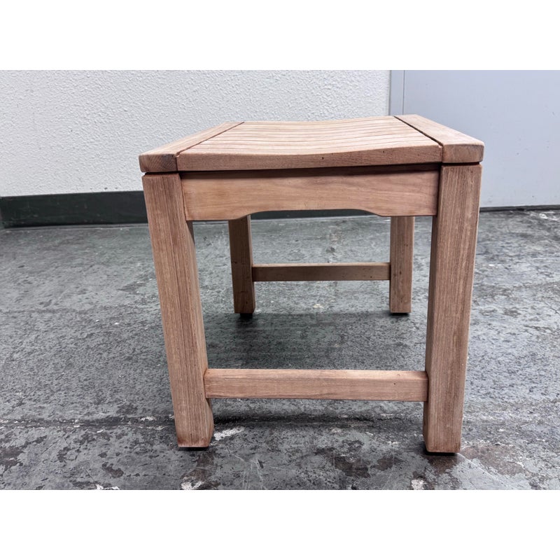 Design Plus Gallery presents a Rosemont Bench from Goldenteak. A compact, versatile bench crafted from solid teak wood. The slatted seat encourage airflow and quick drainage, making it ideal for the shower, spa, patio, or as a small side table or plant stand. In good condition, visible and minimal wear from usage. Was used outdoors.