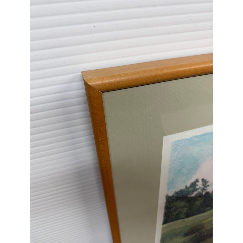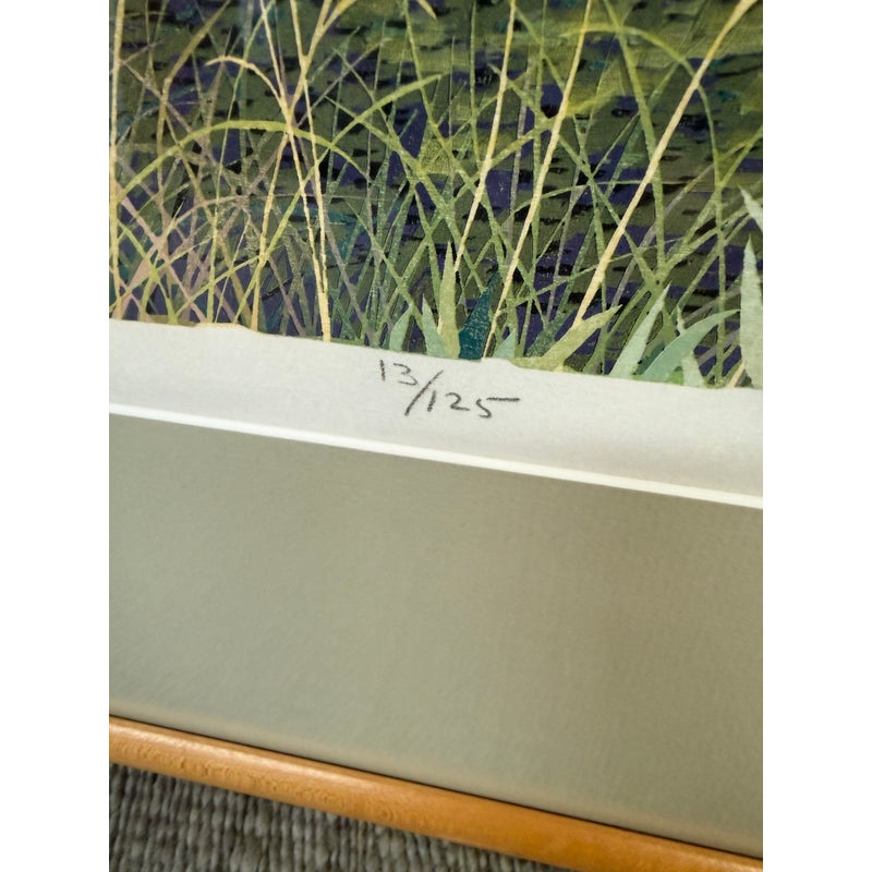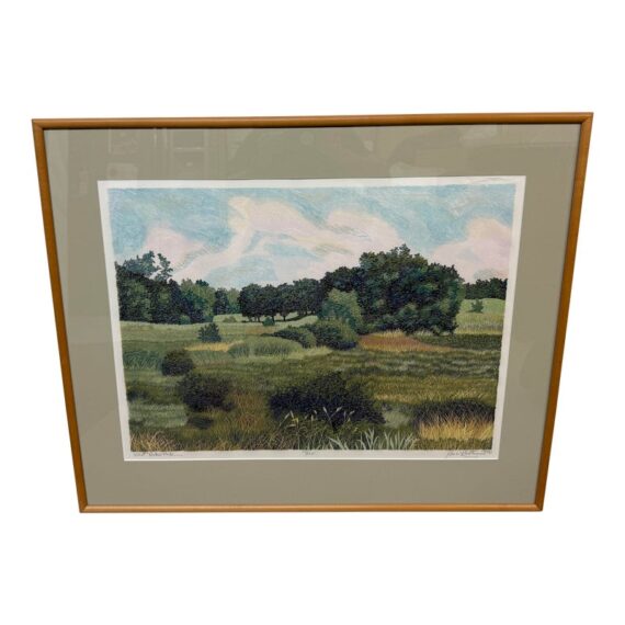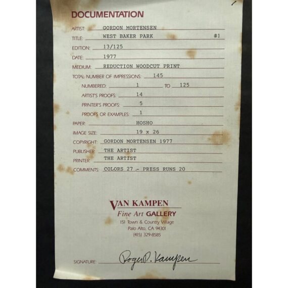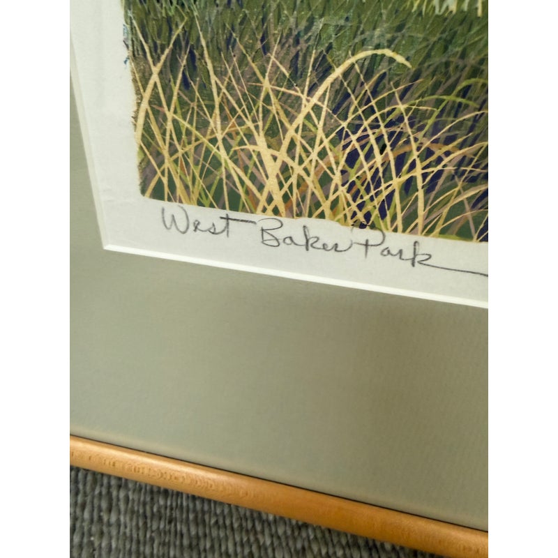 Design Plus Gallery presents “West Baker Park, 1977” a Limited Edition Woodcut Print 47/150 by Gordon Mortensen. A lush landscape featuring perfect specimens of tree, bushes and meadow grasses. The artist has carved the image from a block of basswood based on a watercolor sketch. Two to four dozen colors are incorporated into two to three dozen press runs to produce each edition. Professionally matted and framed, the print is hand numbered and signed by the artist, and protected by glass. Condition is good.