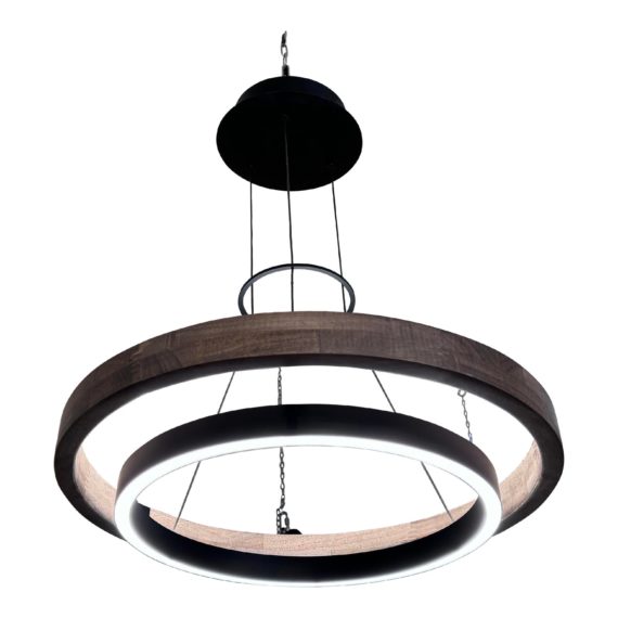Design Plus Gallery presents a Grace LED Chandelier from Visual Comfort Modern. Designed with two rings that illuminate this contemporary chandelier. A large weathered oak outer ring has an organic texture complemented by a decorative black inner ring housing gently diffused upward and downward LEDs. Featuring integrated LED technology on the inner ring, a graceful halo of light. Minor wear from usage.