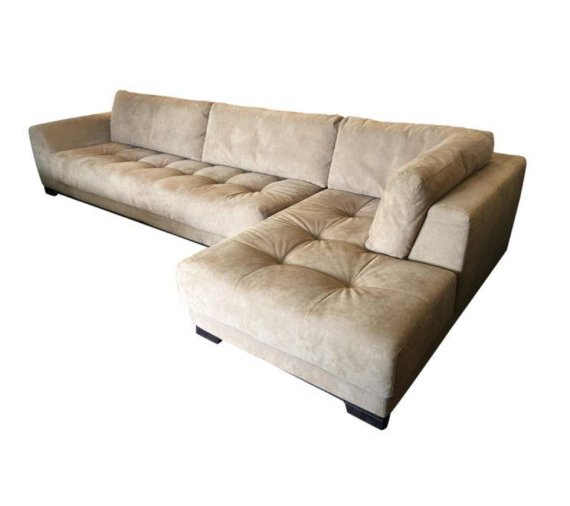 A grand scale sectional from the Guarana Collection, large enough to hold a crowd with room to spare. Deep wide tufting lends a soft visual to the otherwise clean lines. Dark wood base.