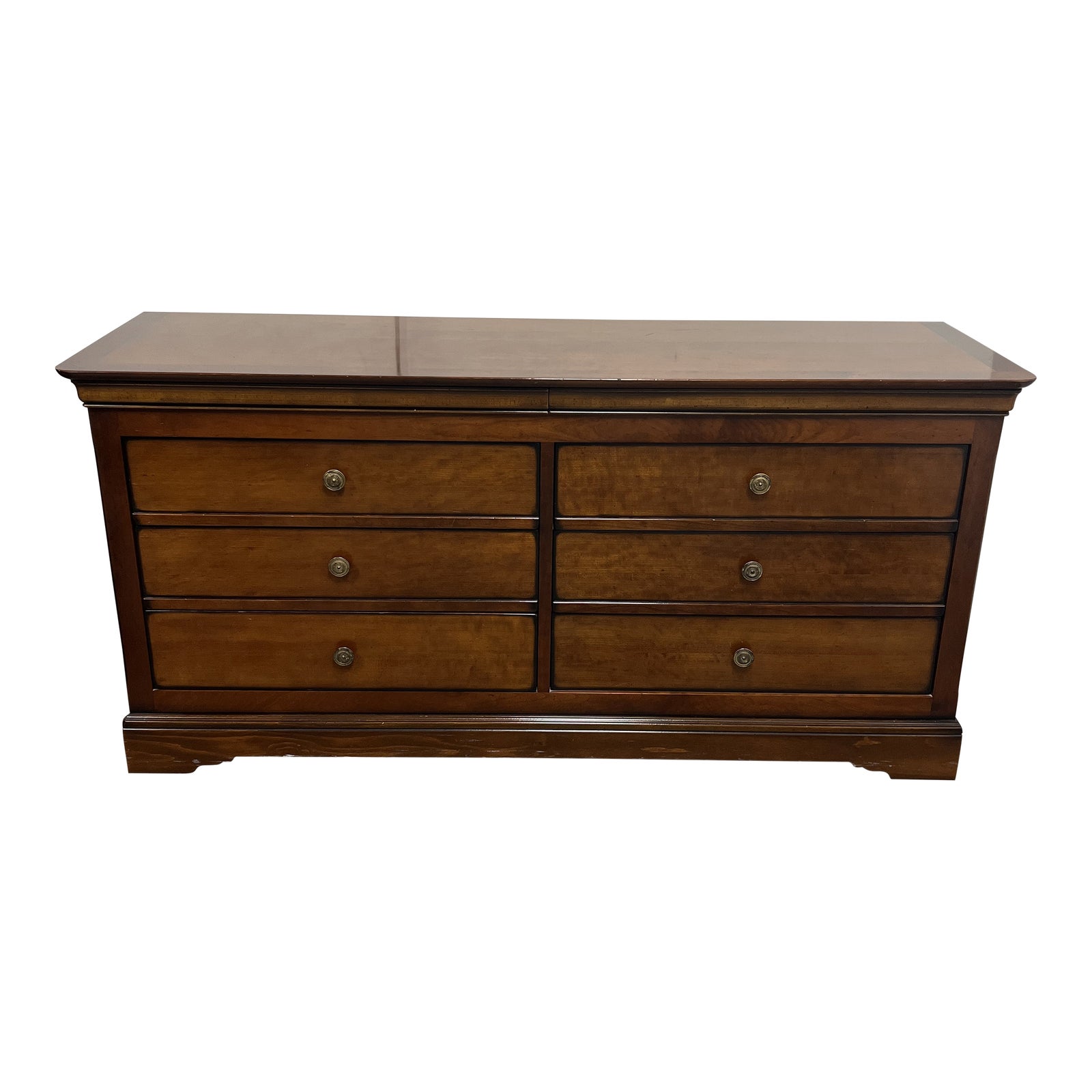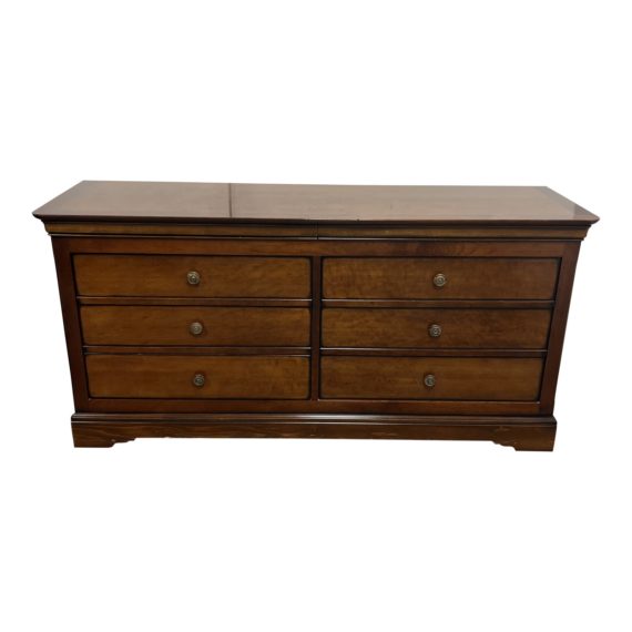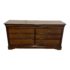 Design Plus Gallery presents an Eight-Drawer Wood Dresser by Grange. It is constructed with wood and holds eight drawers; six regular drawers and two slim, hidden drawers. The drawers are merged using dovetail joinery and feature brass hardware. The top is rectangular with rounded front corners. Minor wear from use; dresser is in good condition.