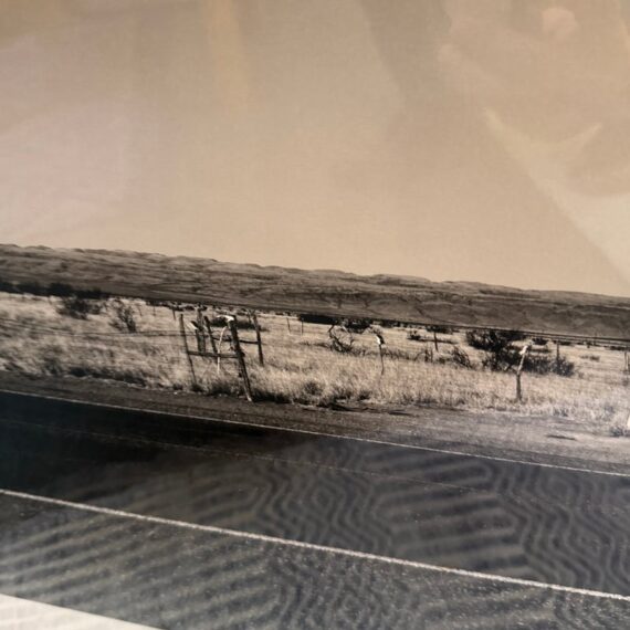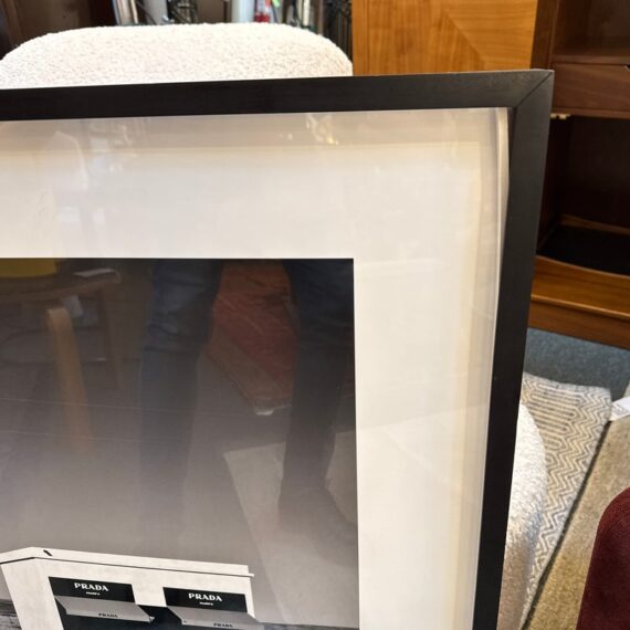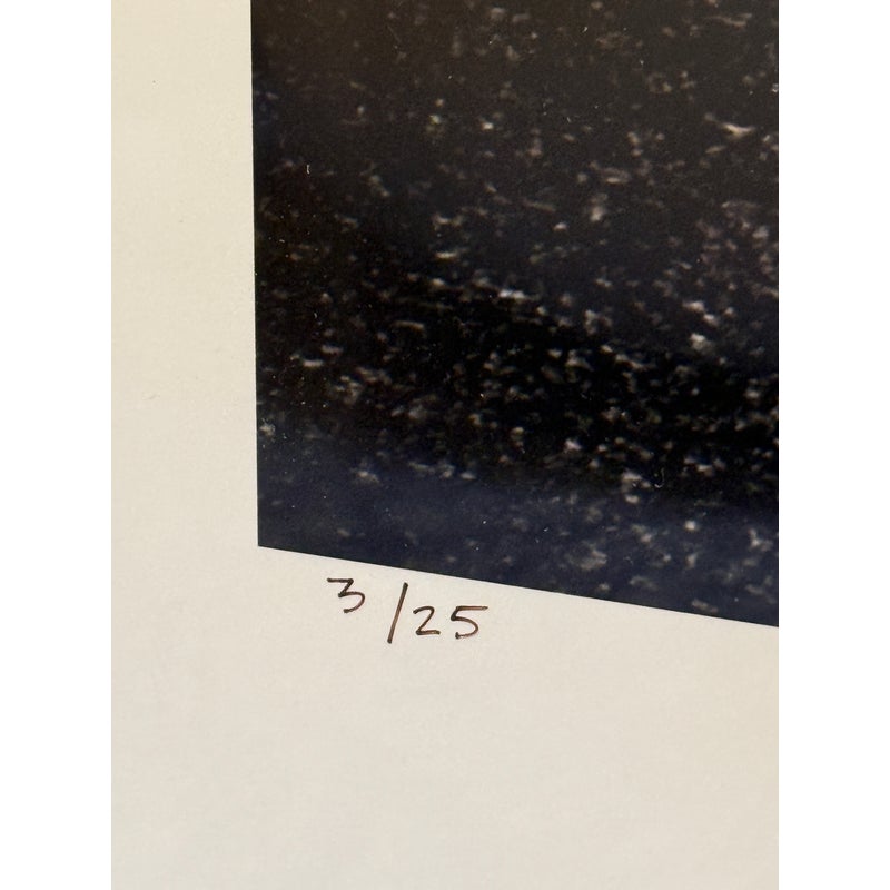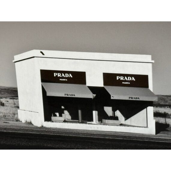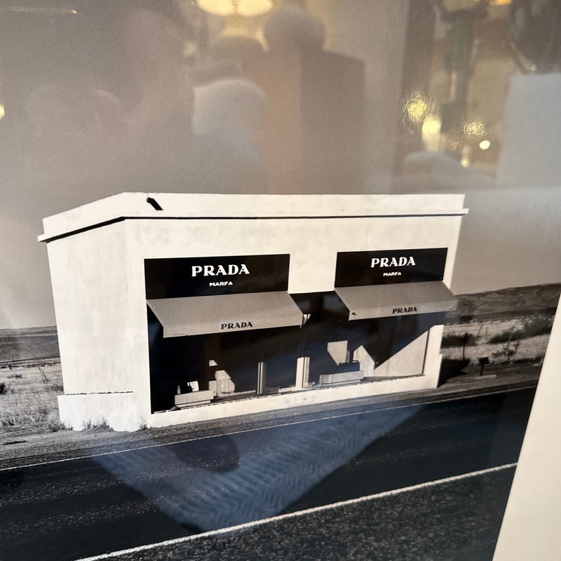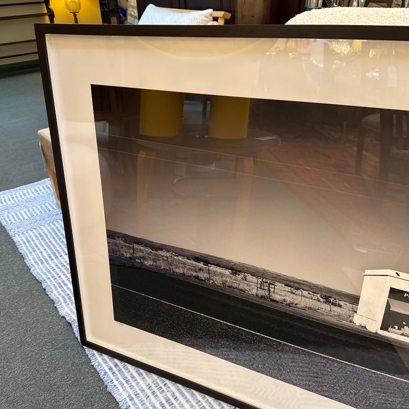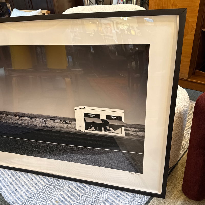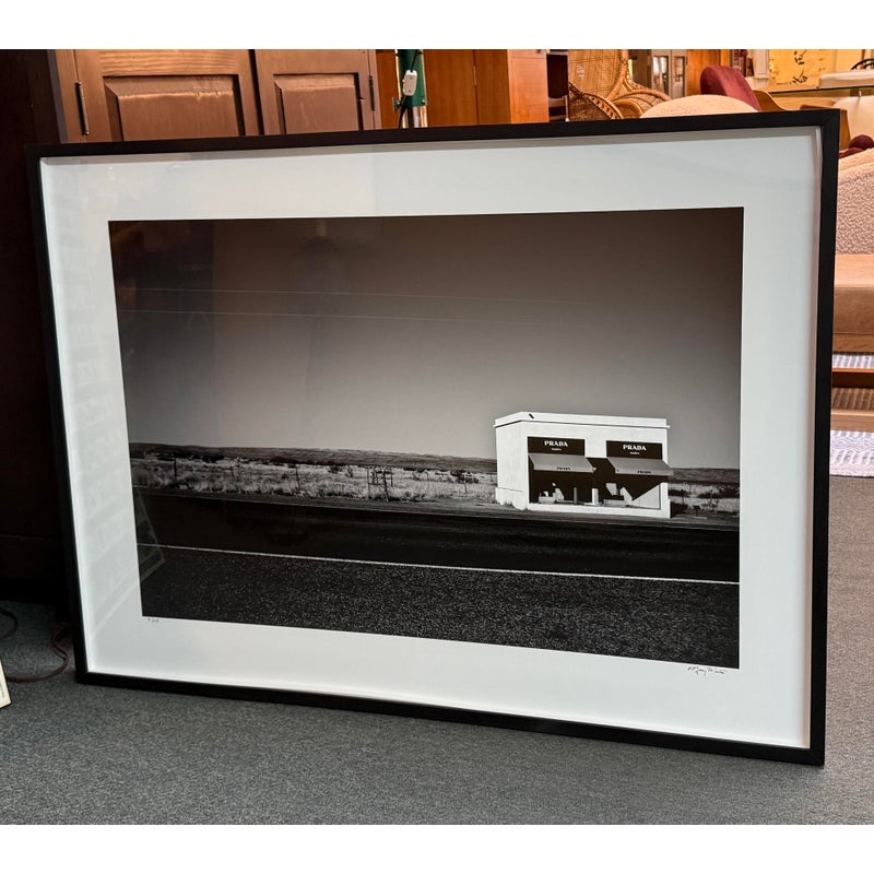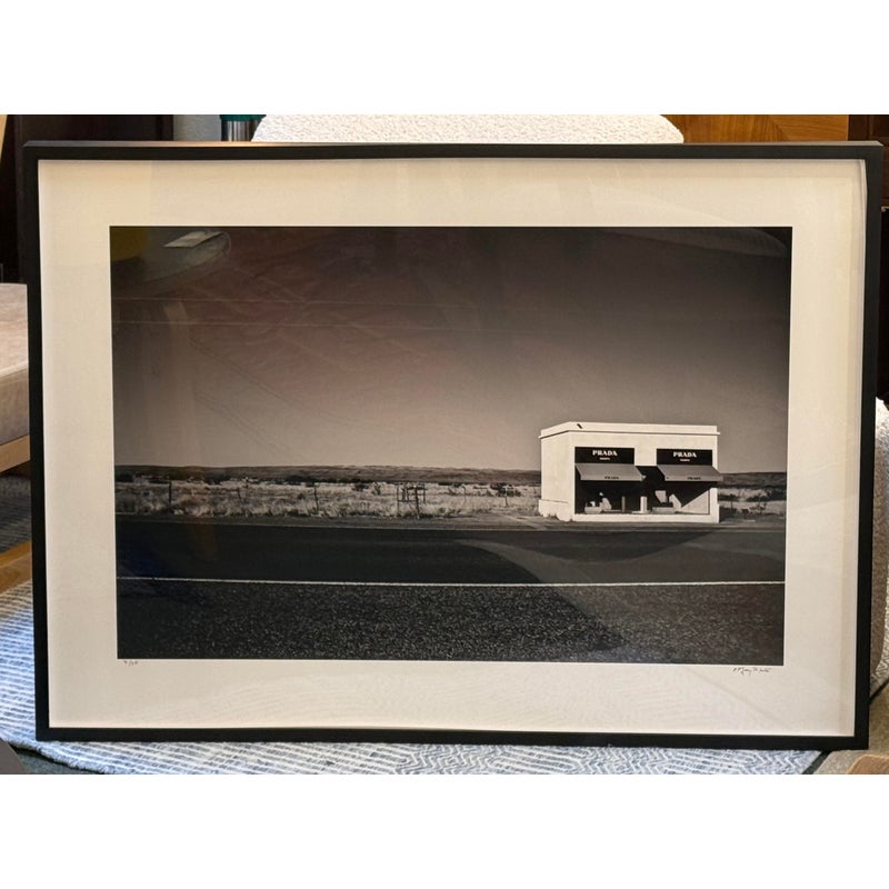 Design Plus Gallery represents Marfa Prada Limited Edition Fine Art Photography by Gray Malin, signed and numbered 3/25. The black and white photograph was taken in Marfa, a small town that became a vital area during the Spanish American War. In the early 1990’s artist Donald Judd came to Marfa and fell in love with West Texas and invited artists from around the world to come and create permanent and temporary art installations in the converted barrack buildings. In 2005 Prada decided to join in on the movement and converted an old gas station into what is now, ‘Prada Marfa’. Filled with purses and shoes, it appears to be a Prada store but there is no access to the public other than intellectually. Professionally matted and framed. Little wear; condition is good.