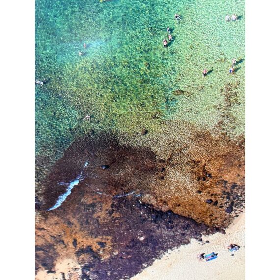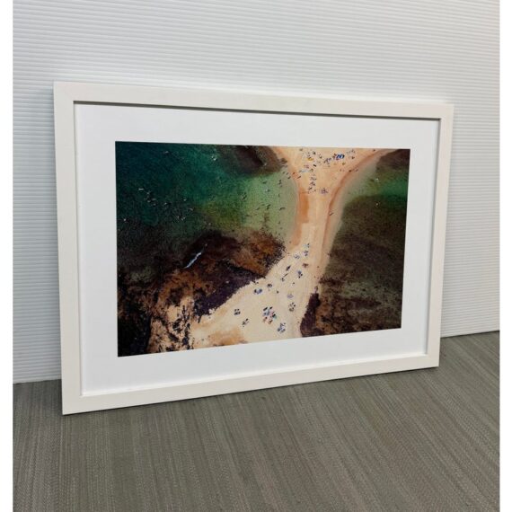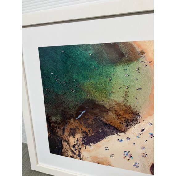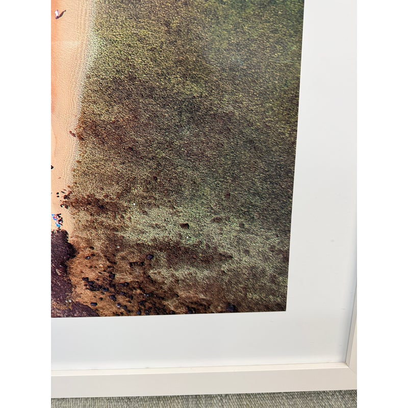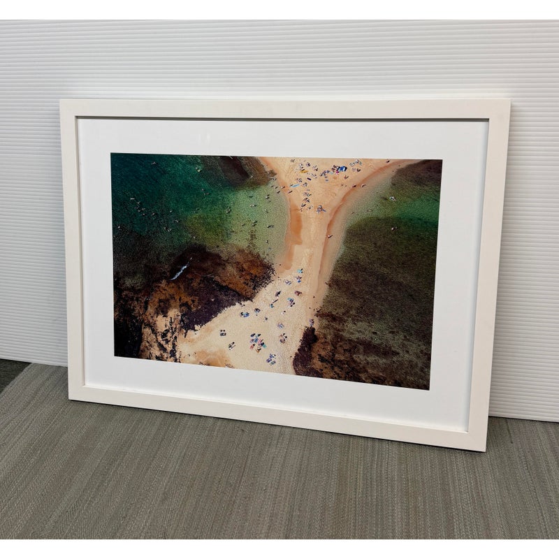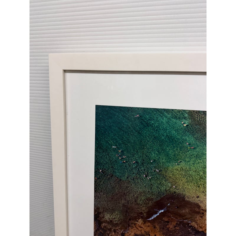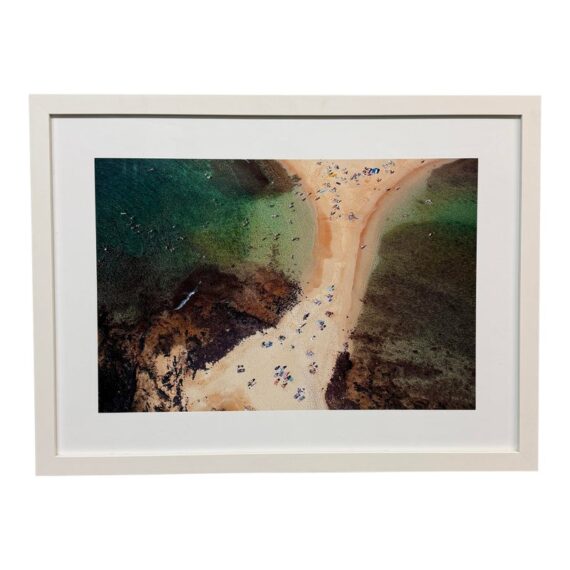 Design Plus Gallery presents “Poipu Beach” Photographic Print by Gray Malin. Feel the Hawaiian sun splashing the brightly dressed beachgoers on the soothing sandy shores in Poipu Beach Hawaii. Gray documented this stunning aerial scene from a doorless helicopter above Kauai. The jaw-dropping image proves that the love of water is a universal experience. Custom framed in a white finish wood frame with a white matte. Horizontal version shown here is no longer available. In good condition, visible and minimal wear. Made in USA.