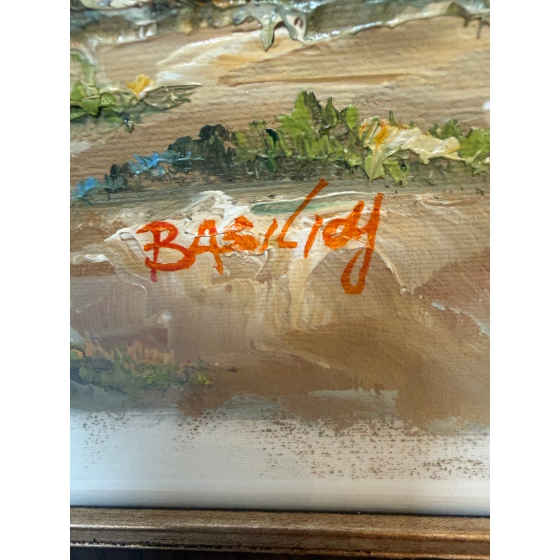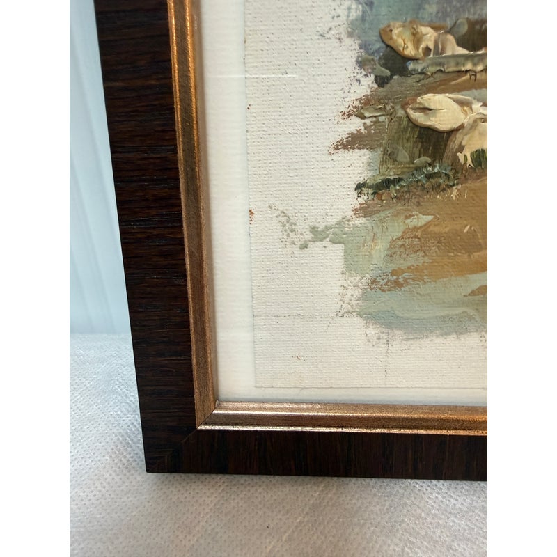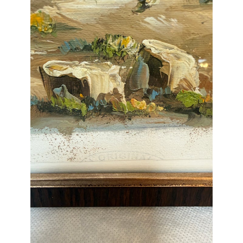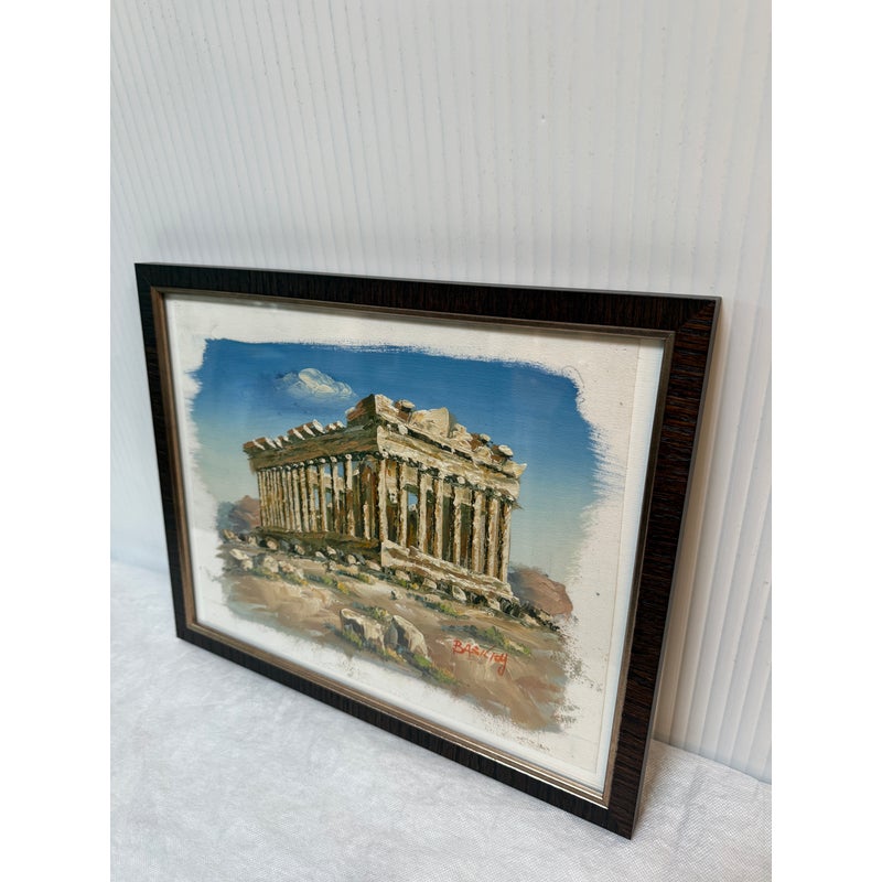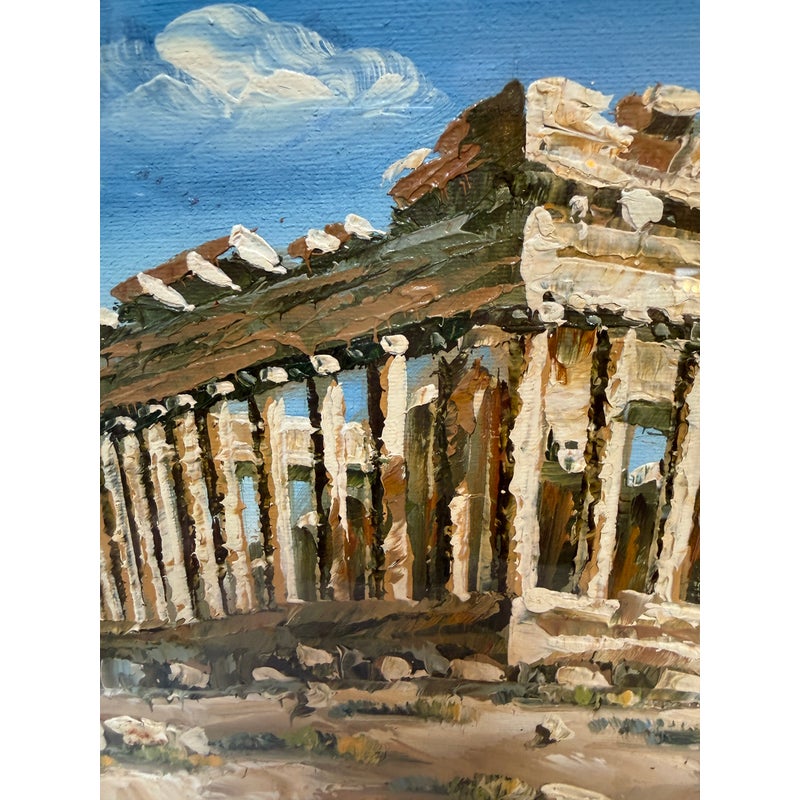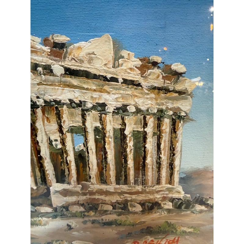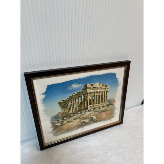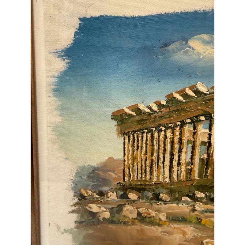 Design Plus Gallery presents a Signed Painting of the Parthenon on the Acropolis of Athens. The painting shows the ancient ruins with a blue sky in the background and green plants in the foreground. The piece is signed on the lower left hand and framed in a brown/gold frame. It is in good condition overall.
