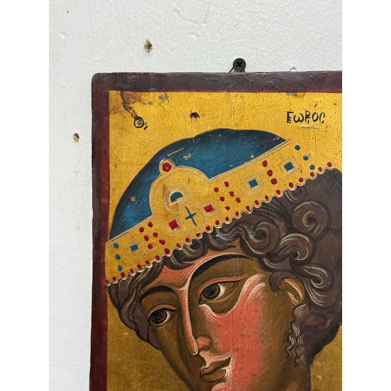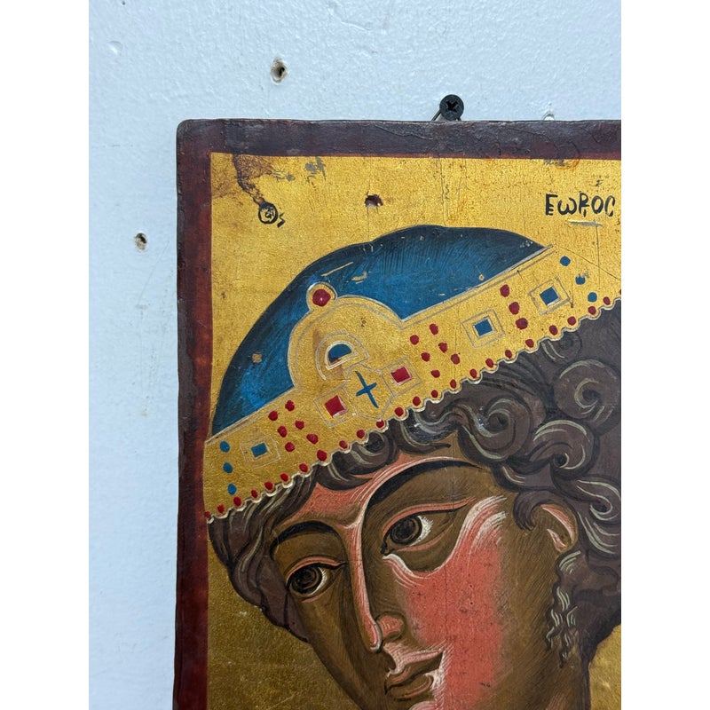 Design Plus Gallery presents an Artist Signed Painted Icon on Wood. “Saint George the Wonderworker” primarily refers to Saint George the Great Martyr and Victory-Bearer, a 3rd-century Roman soldier who became a Christian martyr. He is venerated in many religions for his military achievements and miracles, including defeating a dragon. This icon on wood is gleaming with gold and offers great sheen if placed in a lighted area. The antique artwork is in good condition for its age + use.