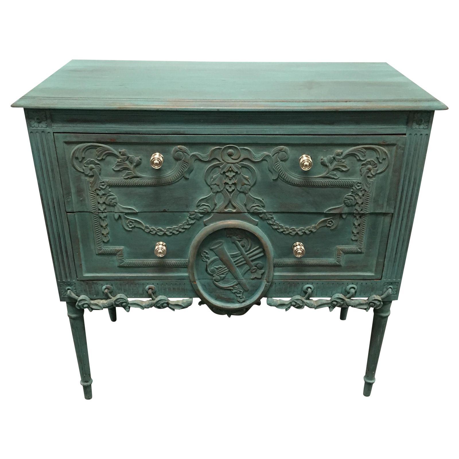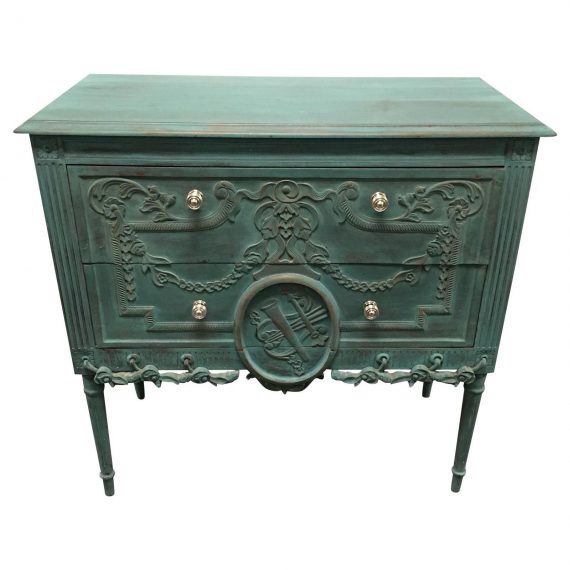 Design Plus Consignment Gallery has a green French two drawer sideboard from Gumps. The wood beauty has a green chalk distressed finish. Ornate carved details covers three sides of the sideboard. A circle carved frame with a harp design motif is a main focus. The door handles are in a silver finish. The backing and inner drawer’s has exposed natural wood. This piece can be used in the entry way, dining room, living space, and a dresser for the bedroom.