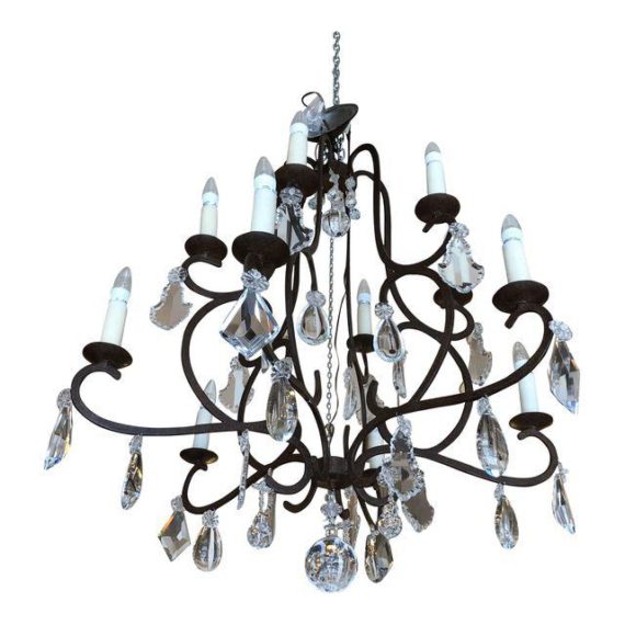 Design Plus Gallery presents Rousseau Chandelier with Crystals by Gregorius Pineo. The frame is hand-forged Iron with six arms with crystals. Consist of 12 lights wired with UL approval for candelabra base bulbs, 25 Watt max each. There are waxed covered candle sleeves. The finish is Antique Rusted Iron. “We are a story of Artisanal Couture, where passion, innovation and artistry meld to reveal the intrinsic beauty of a material through handcraftsmanship. “- Gregorius Pineo.