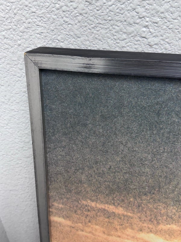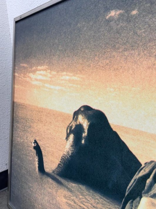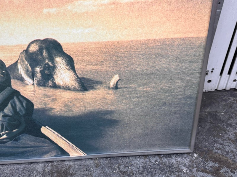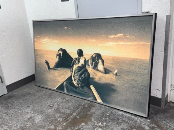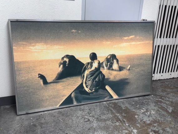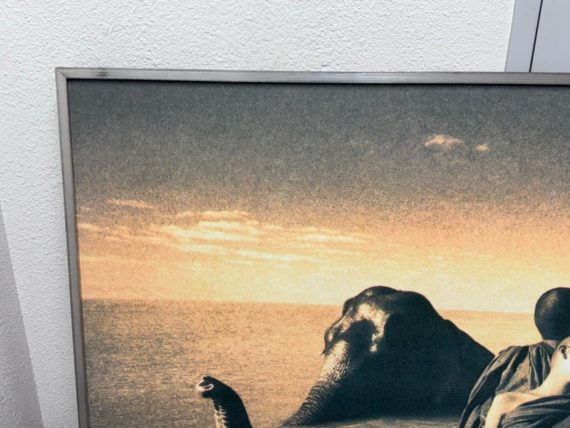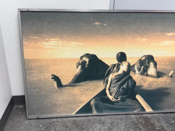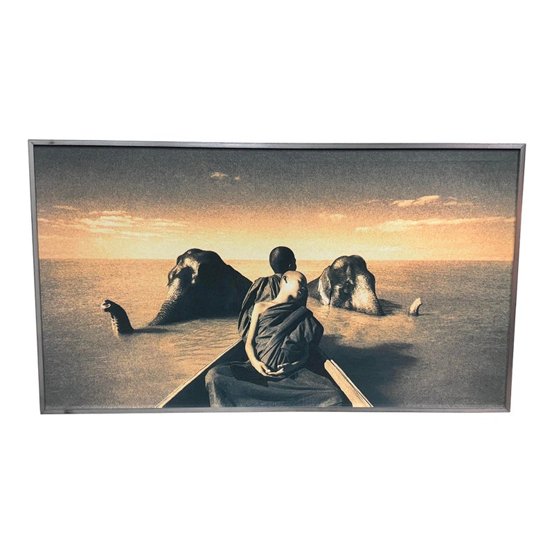 Design Plus Gallery presents a Framed Photography of Acclaimed Wildlife Photographer, Gregory Colbert. The image shows two boys in their boat, leaning into each other’s back while seated at the bow. A truly remarkable scene is captured with two elephants on either side of the center line, trunks up with a stunning sky in the horizon. Is in good condition with minimal signs of wear for its usage.
